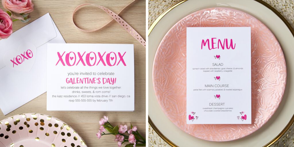 Naturally, every party starts with the perfect invitations. First, send your girlfriends personalized cards inviting them to your DIY Galentine’s Day party. You can even make your own with our printable postcards and free predesigned templates.