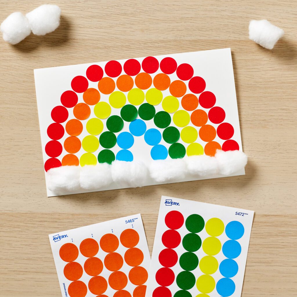 Avery color-coding dots are shown used to make a rainbow card craft for kids. The colorful dots are stuck on a blank Avery card in the shape of a rainbow and cotton balls are used to make clouds.