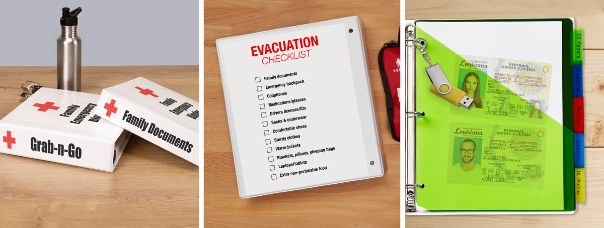 Create copies of your family documents for “grab-n-go” binders that you can store near exits and in vehicles. Clearly label “grab-n-go” binders vs. the binder for your original documents. Organize the documents in all your binders and update information and photos once a year.