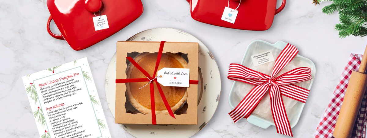 Create a family recipe book. Collect family recipes in a binder and present them as a gift for every household. Start a tradition of adding new recipes every year. Decorate the cover with a personalized recipe book template.