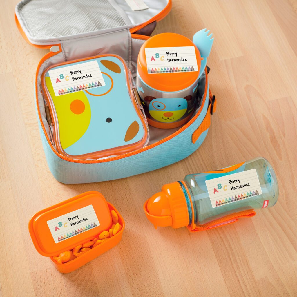 However, it’s also important to consider how you will need to clean the school supplies you want to label. Lunch boxes and fabric items that will go in a dishwasher or washing machine require labels designed for that purpose. For all other school supplies, durable, water-resistant labels are a great place to start.