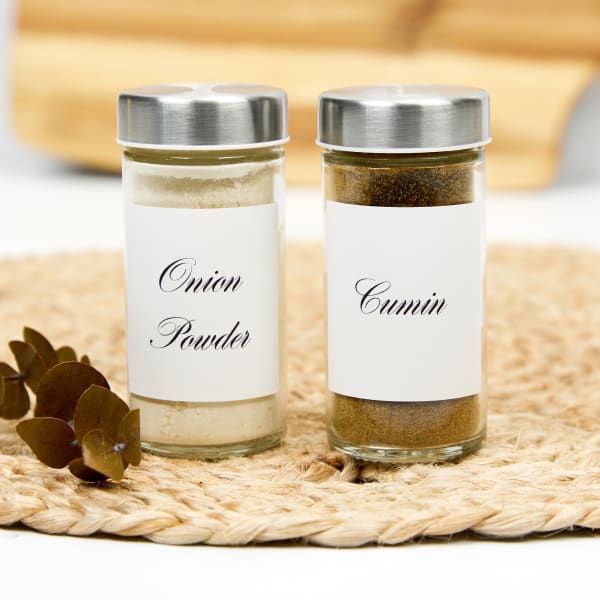 First, choose the best size for your labels. Two-inch round or square labels fit most common four-ounce spice jars. However, if your jars are a different size, you can use our printable ruler and guide for choosing the right label size. Second, pick a label material that is compatible with the type of printer that you have and has a durability level that matches how the spice jars will be used.