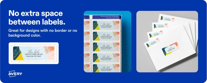 Labels without space between them are better for designs that use borders or no background color at all. This condensed layout also allows for more labels per sheet, making this more cost-effective. For example, address labels for mailing lists and file folder labels would work perfectly with this sheet design.