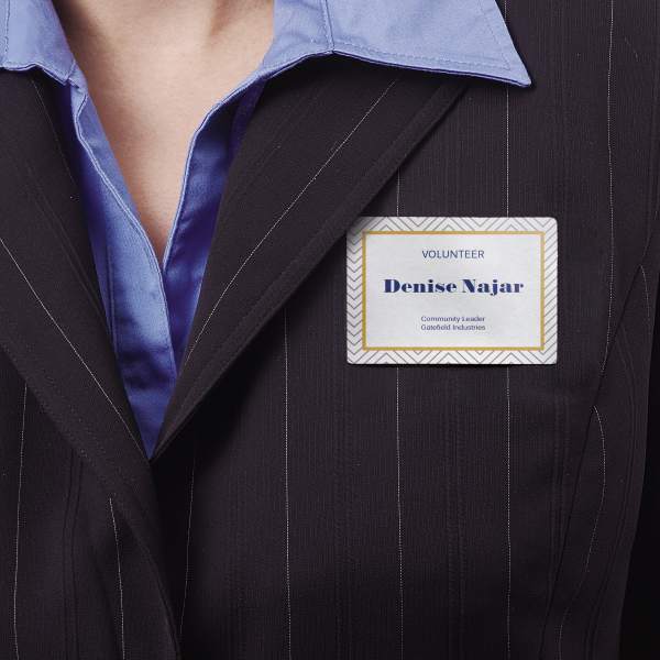 Avery offers complete customization and professional printing so you get sharp, crisp name tags printed on our top-of-the-line digital printers. Our adhesive name tags stick securely and move with fabrics without falling off or leaving a residue. Easily add different names to each badge and have them professionally printed before your special event. With our easy-to-use design software you can get precisely the style you want, whether you want to add your company logo, a fun fact, or an ice breaker. Simply personalize the template, upload your contact list and order.