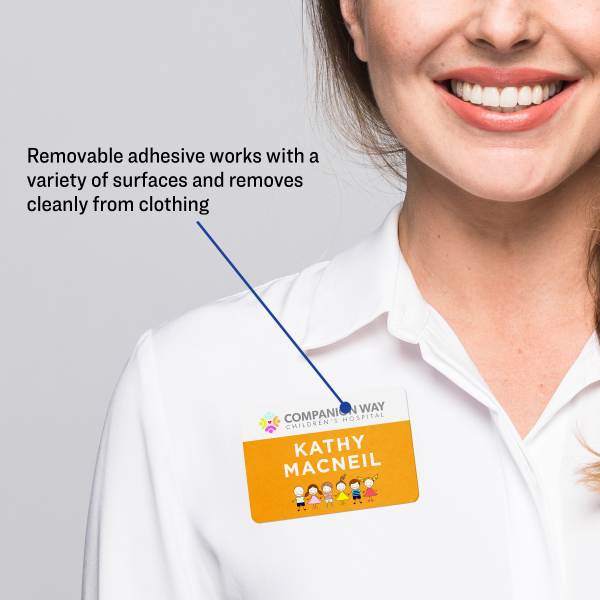 Order our customizable adhesive name badges, designed to feature your logo or other personalized information. These name tags stick securely to fabric and flex with movement without falling off, making them ideal for any event.