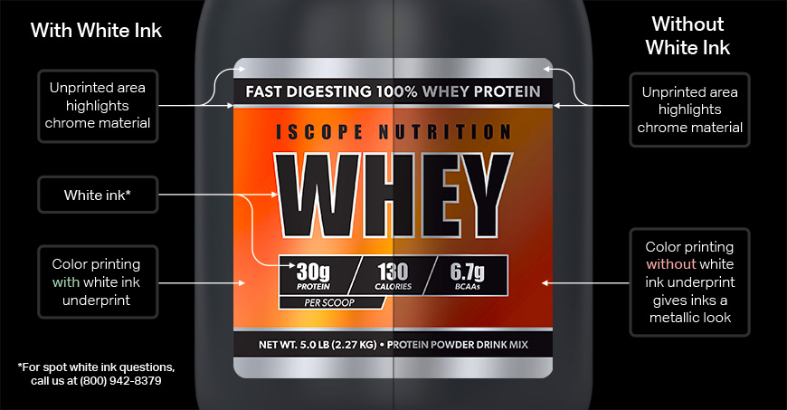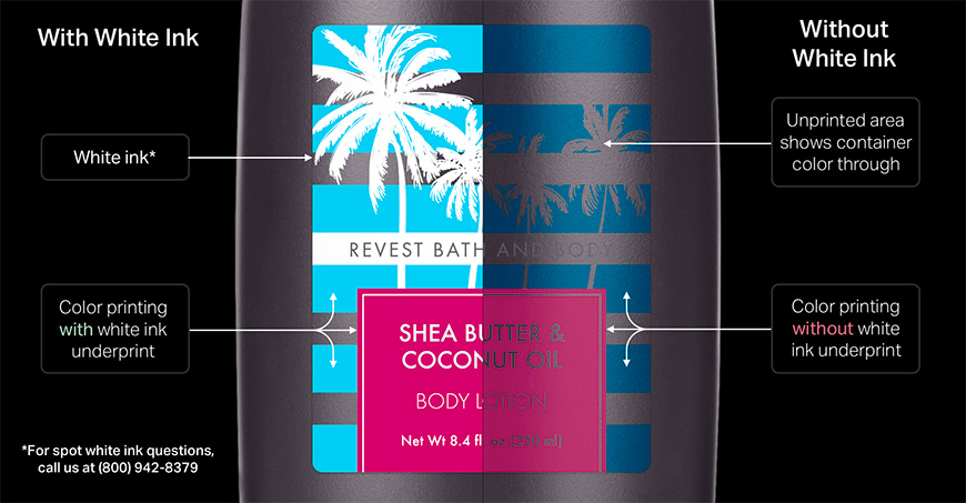 White underprint is the ability to print white ink on your labels to help lighter colors stand out on transparent labels. On the images below, view examples of the materials with and without white ink underprinting available on our roll label materials.