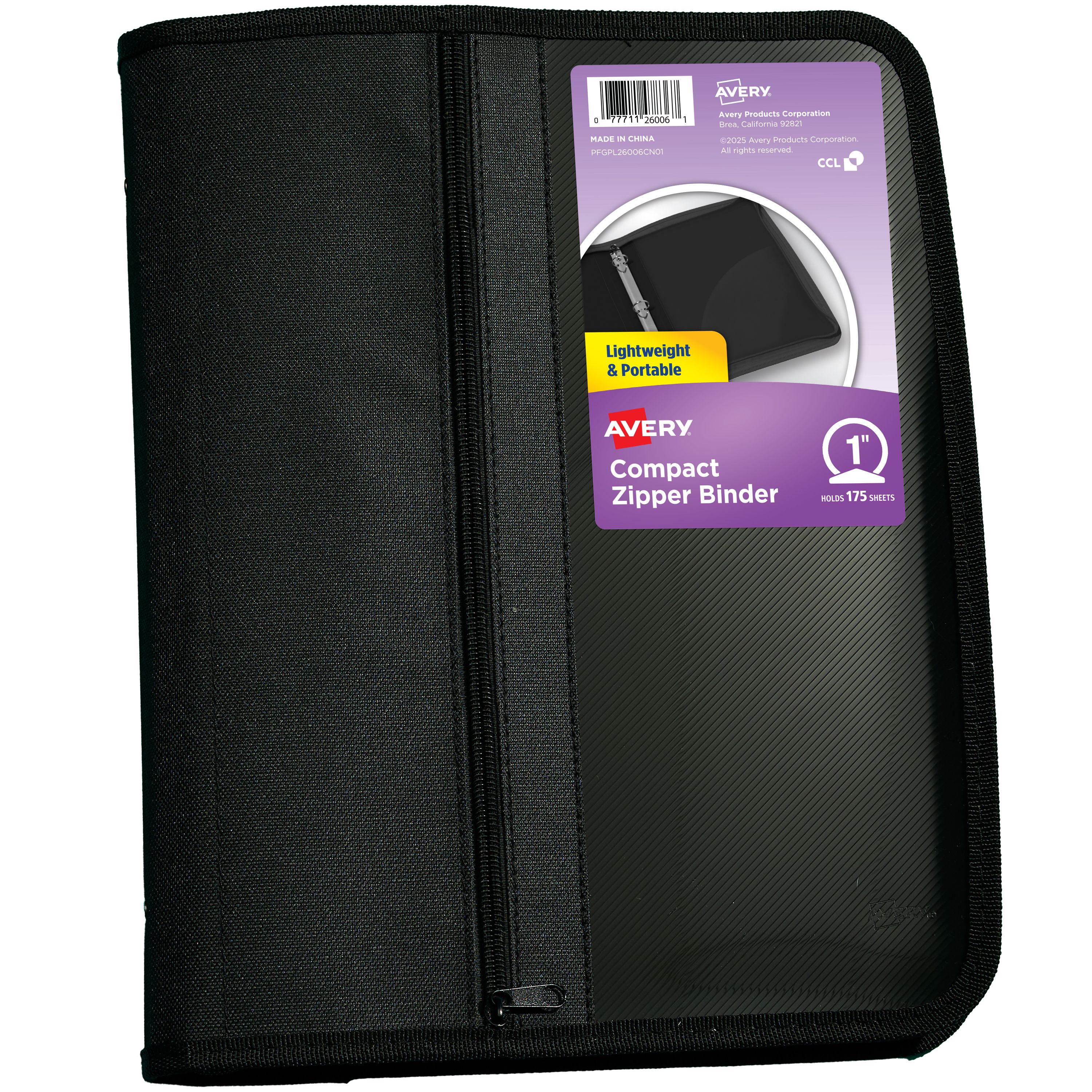 Avery® Zipper Binder, 1" Round Rings, 175-Sheet Capacity, Black Binder with Pocket (26006)