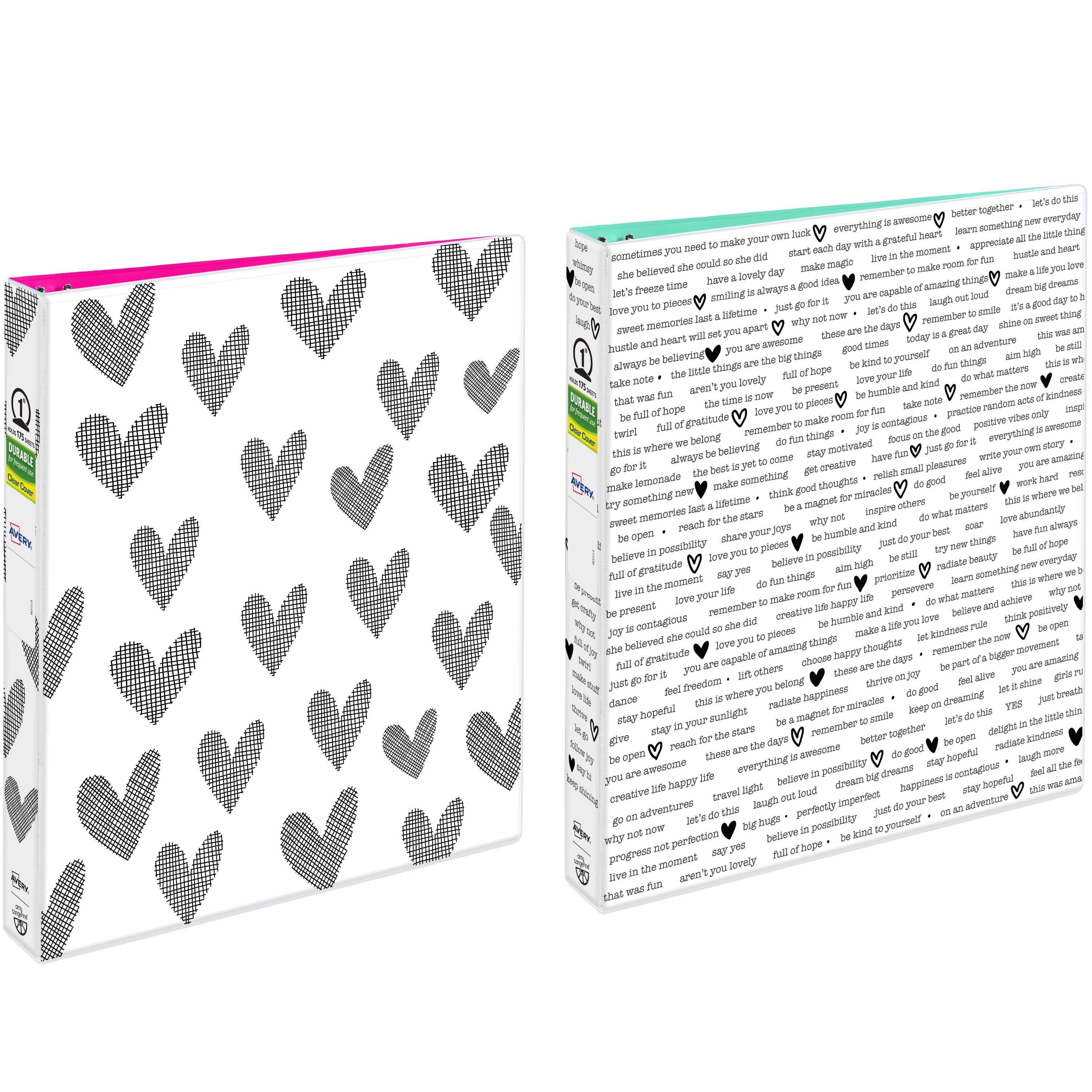 Avery® + Amy Tangerine® Designer Collection Durable View Fashion Binder, 1†Round Rings, 175-Sheet Capacity, Hatchmark Hearts & Find Your Inspiration Designs, Two Binders (26852)