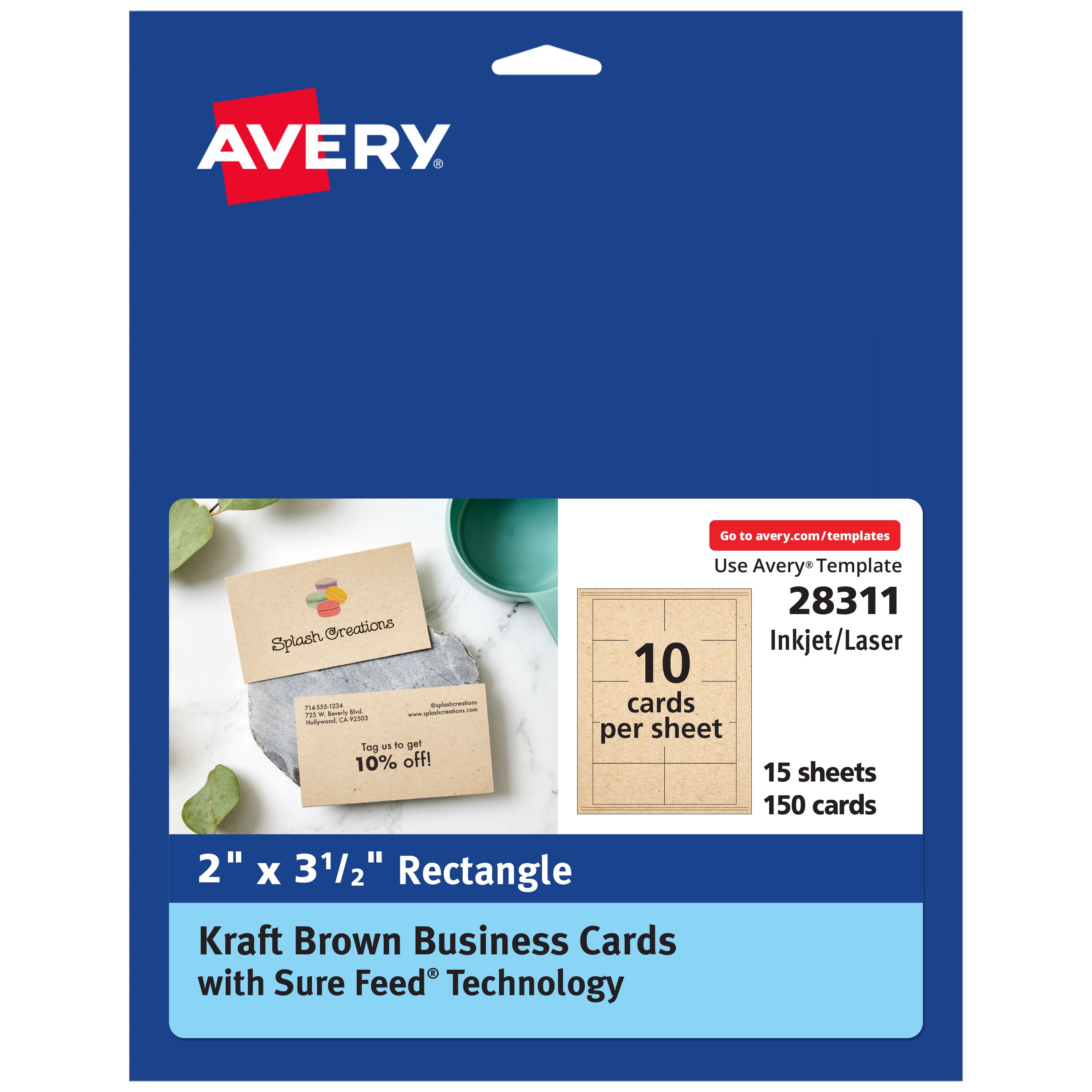 Avery® Kraft Brown Business Cards with Sure Feed® Technology, 2" x 3.5", Laser/Inkjet, 150 Business Cards (28311)