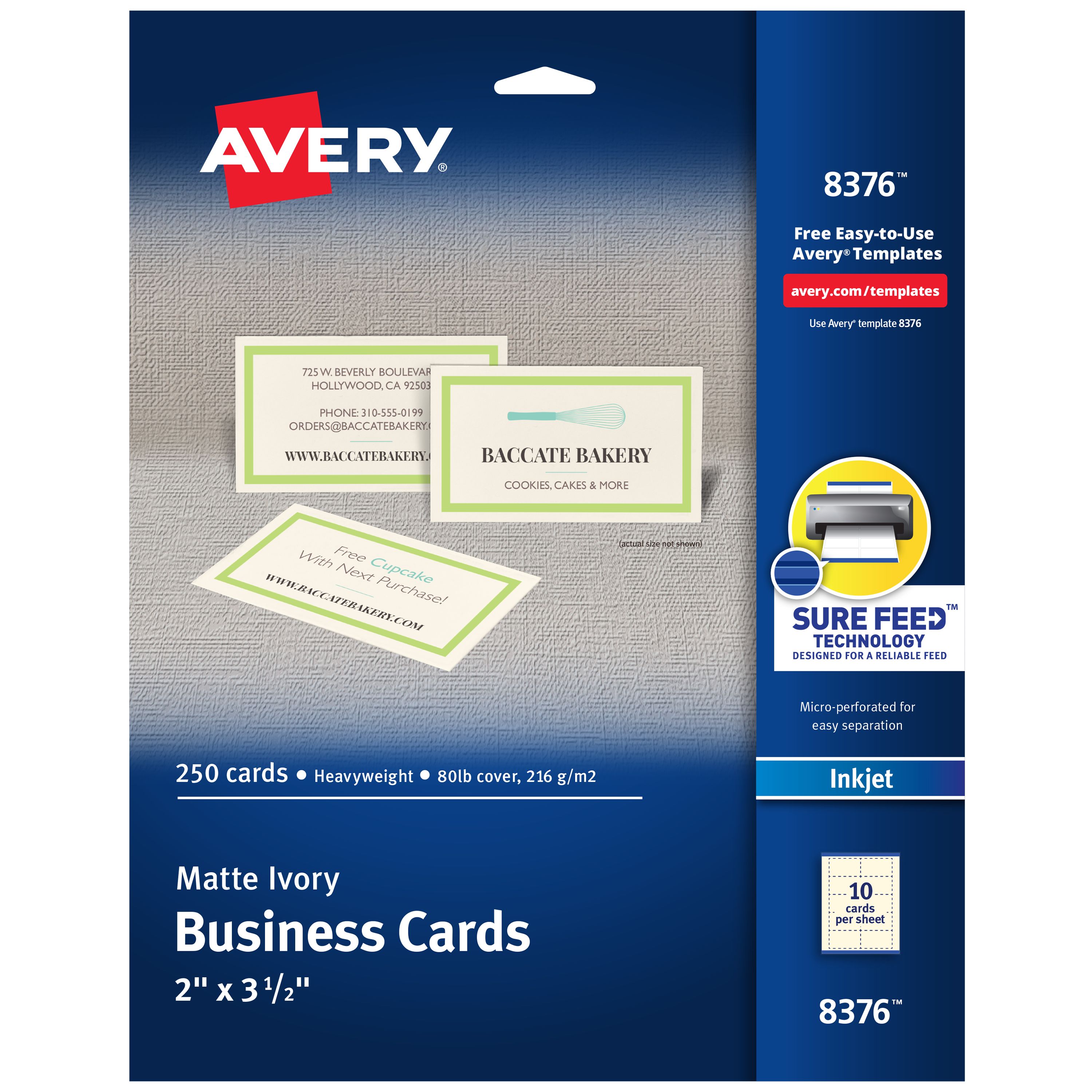 Avery Sure Feed technology which helps improve printer alignment to avoid jams. Each sheet features a precise series of cuts to make sure each card separates cleanly with no frayed edges.