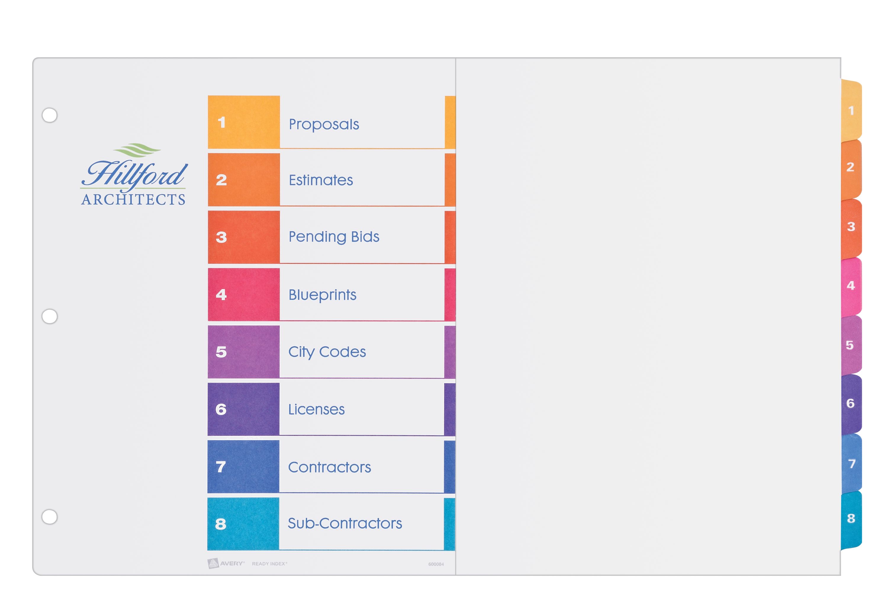- Preprinted white numbers 1-8 on bold multicolor tabs