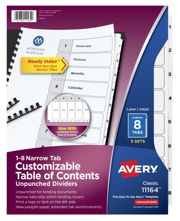 Avery® Narrow Tab Customizable Table of Contents Unpunched Dividers, Ready Index® Printable Section Titles, Preprinted 1-8 White Tabs, 5 Sets (11164)
