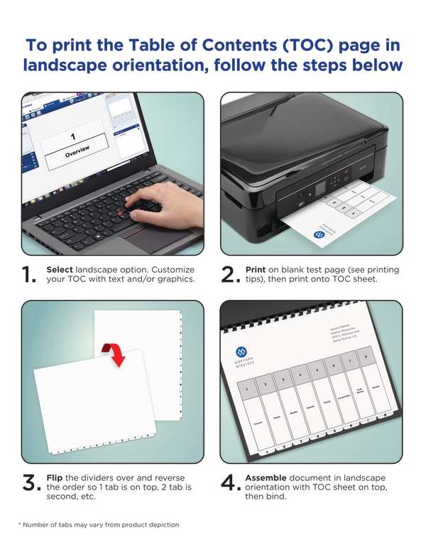 - Double-sided section titles page and tab dividers provide flexibility to use in portrait or landscape orientation