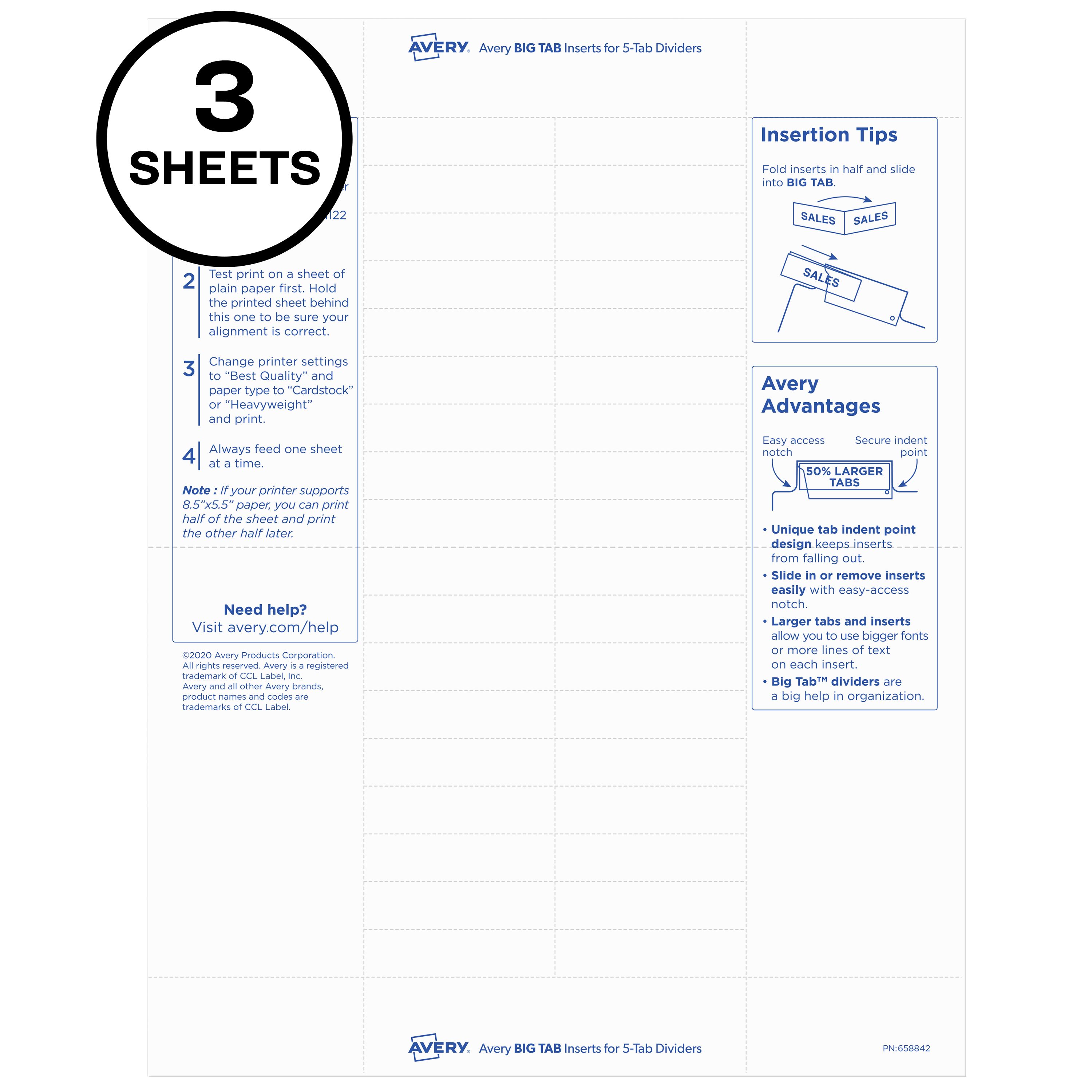Avery® Big Tab™ Insertable Divider Insert Sheet Refills, 5-Tab, 3 Sheets, 54 Inserts (11227)