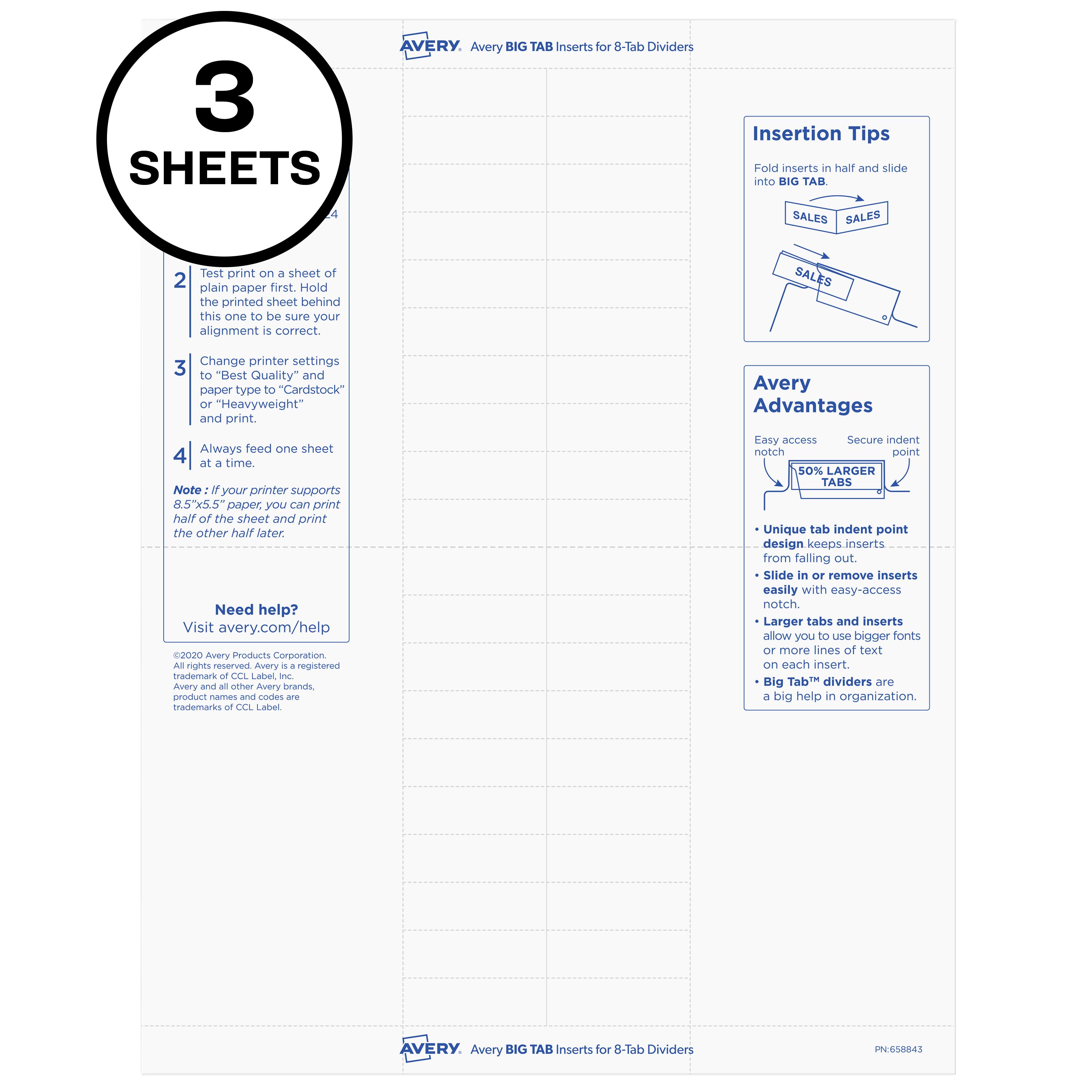 Avery® Big Tab™ Insertable Divider Insert Sheet Refills, 8-Tab, 3 Sheets, 60 Inserts (11228)