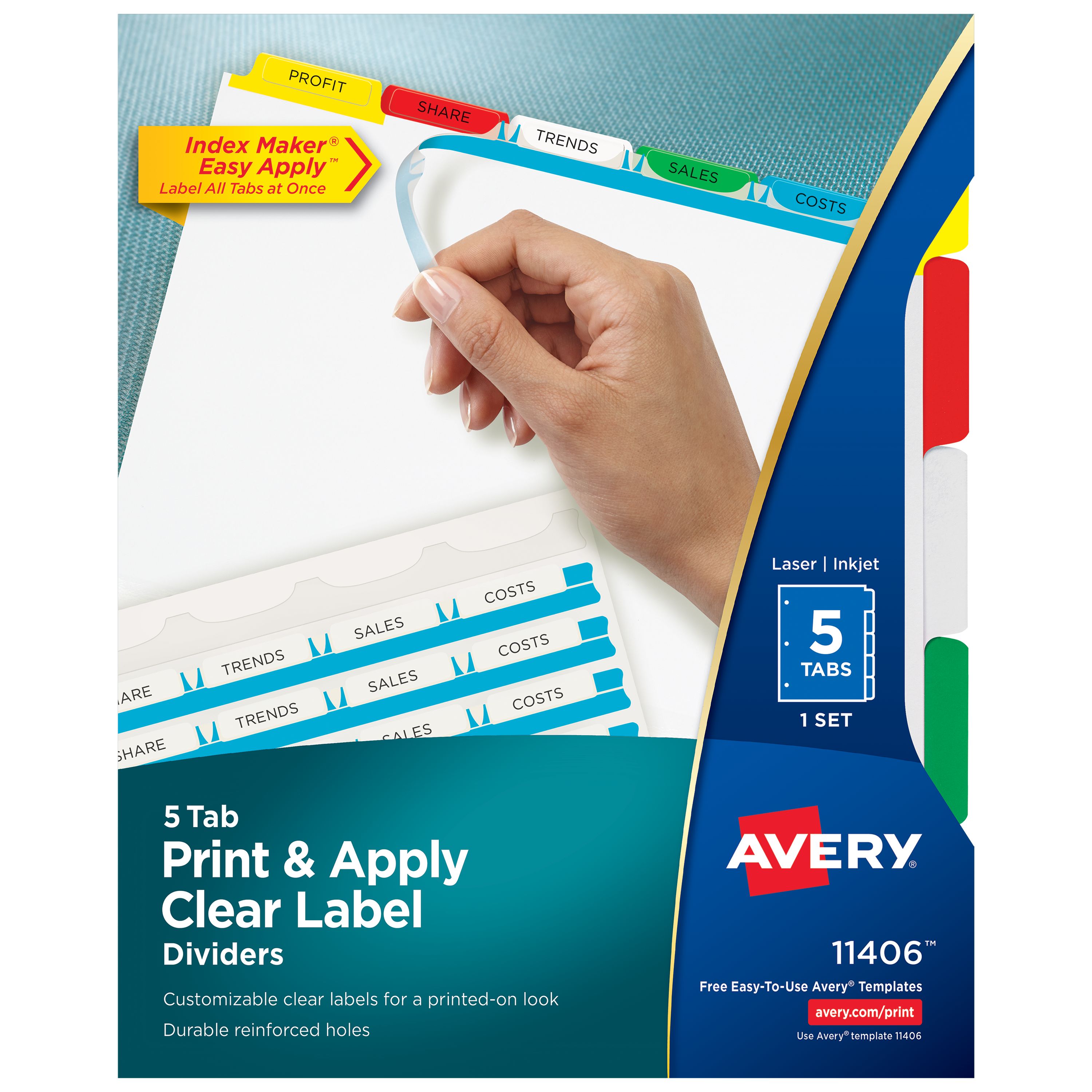 Avery® Print & Apply Clear Label Dividers, Index Maker® Easy Apply™ Printable Label Strip, 5 Multicolor Tabs (11406)