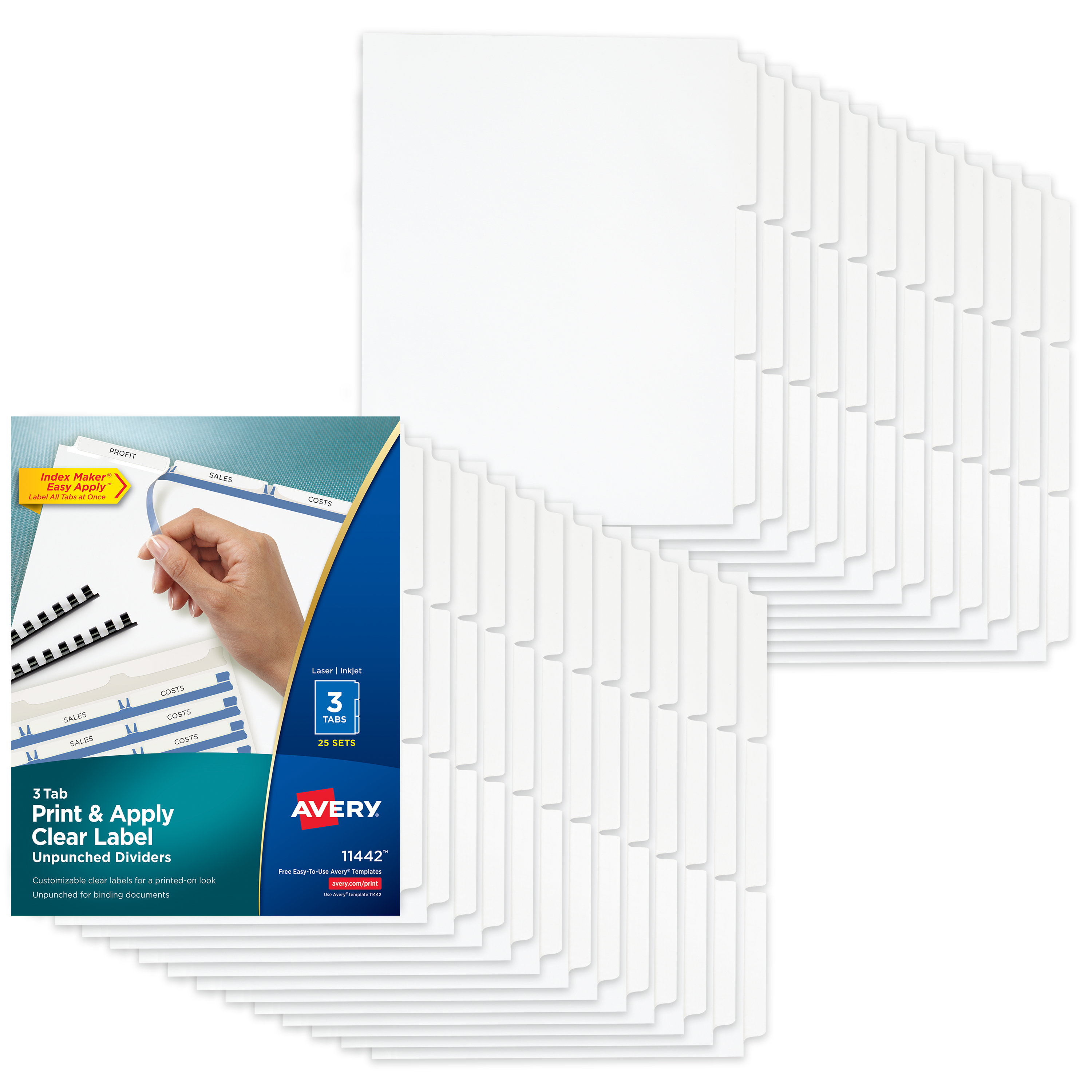 Avery® Print & Apply Clear Label Unpunched Dividers, Index Maker® Easy Apply™ Printable Label Strip, 3 White Tabs, 25 Sets (11442)
