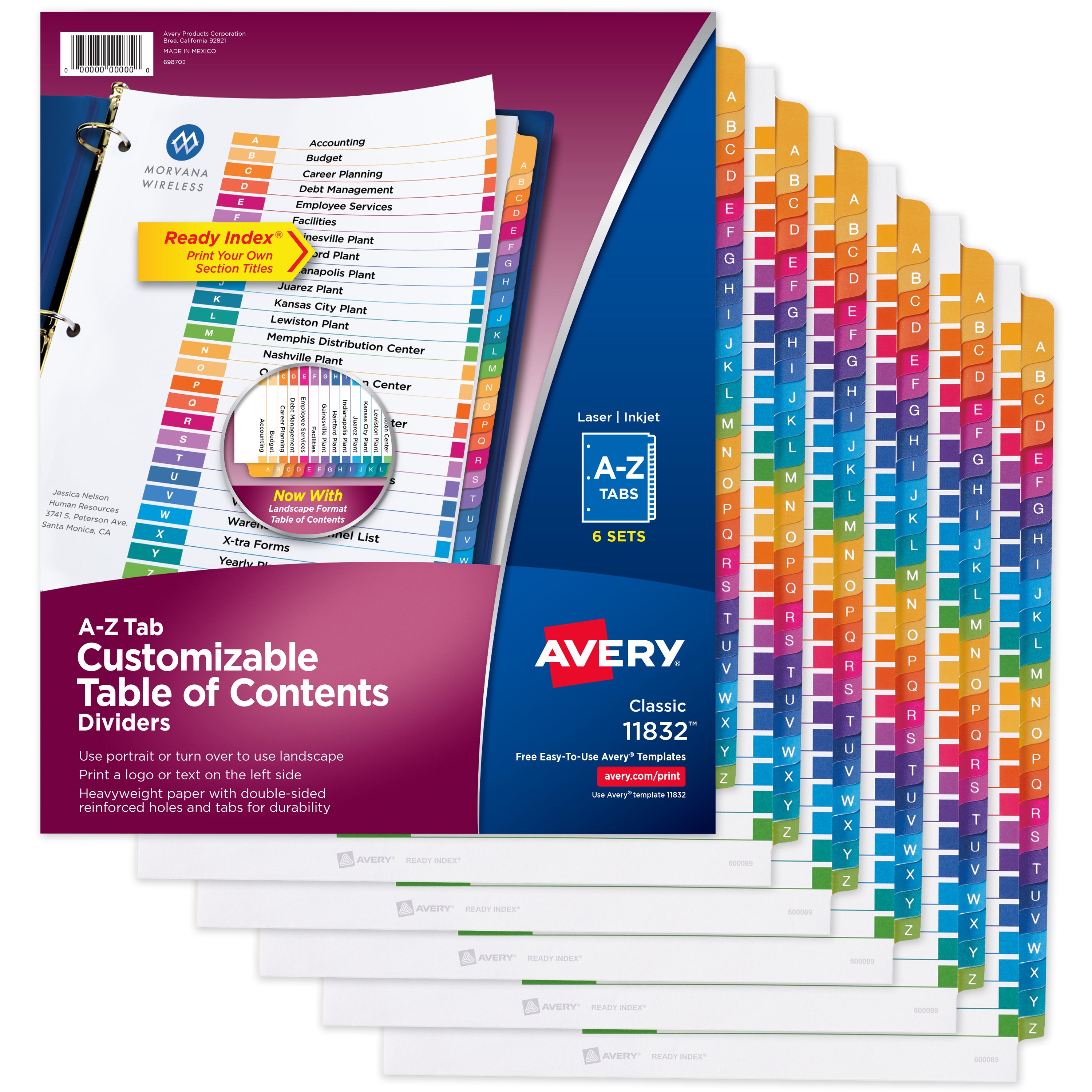 Avery® Ready Index® A-Z Dividers, 26 Tab Sets, Customizable Table of Contents, Multicolor Tabs, 6 Sets (11832)