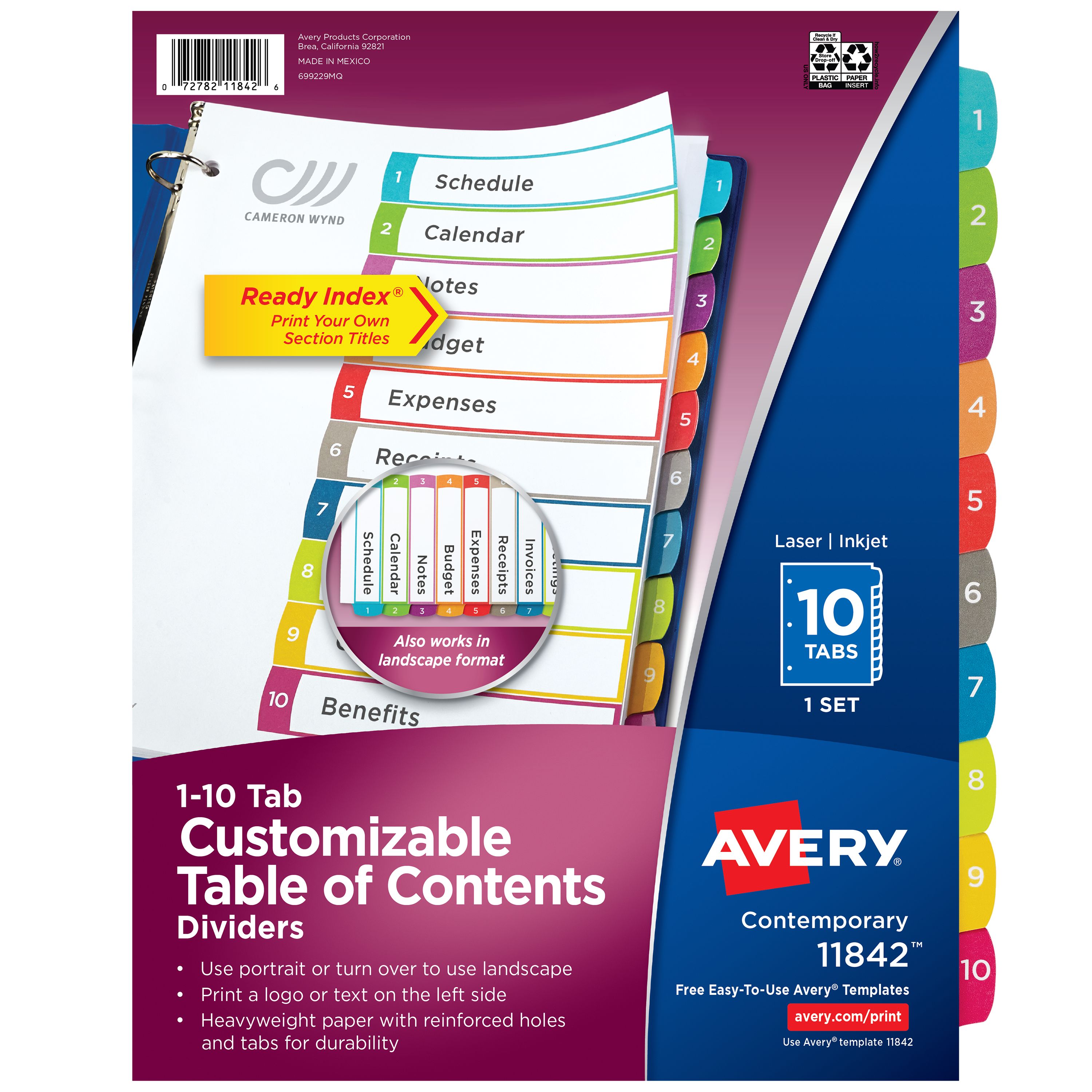Avery® Ready Index® Dividers, 10 Tab Sets, Customizable Table of Contents, Multicolor Arched Tabs (11842)