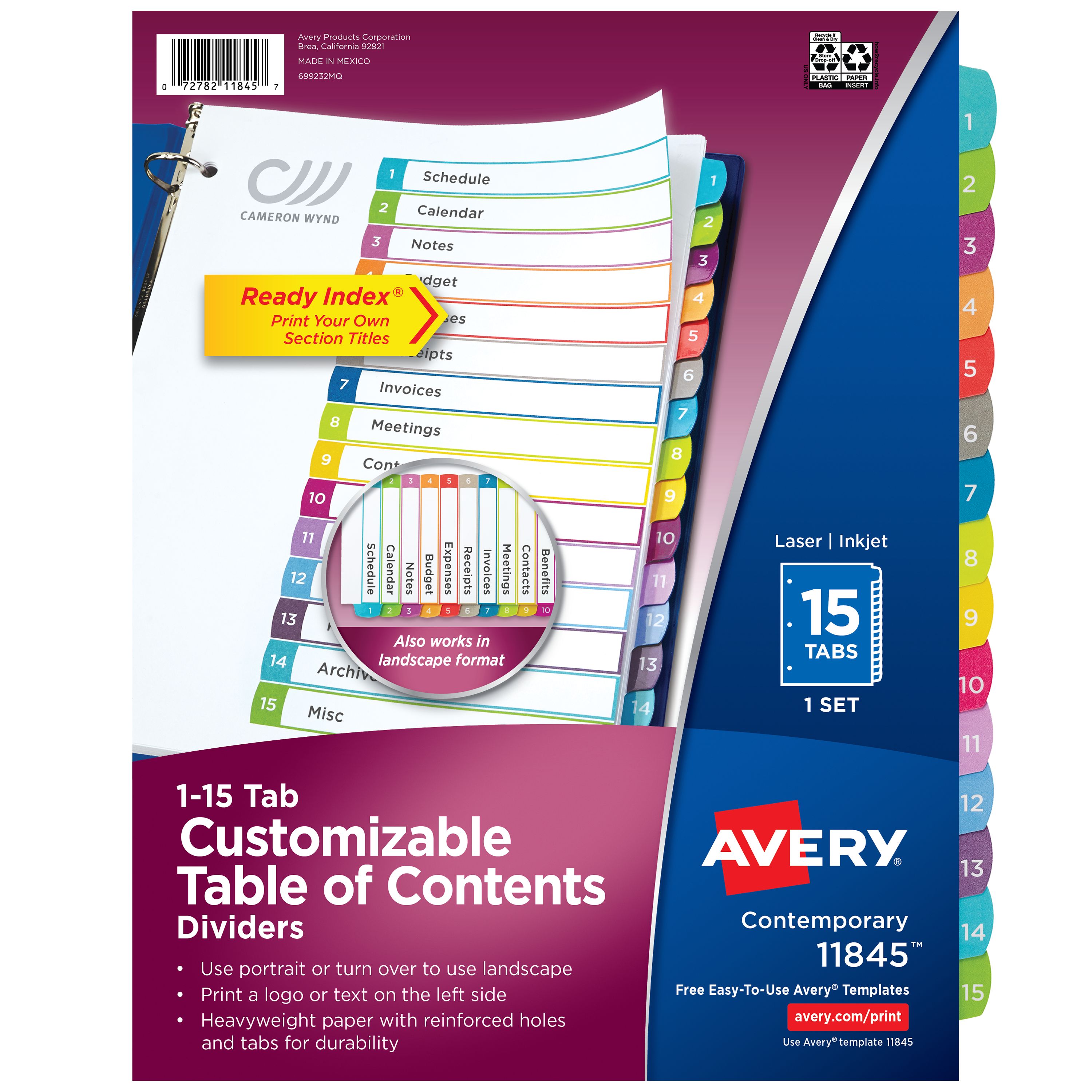 Avery® Ready Index® Dividers, 15 Tab Sets, Customizable Table of Contents, Multicolor Arched Tabs (11845)