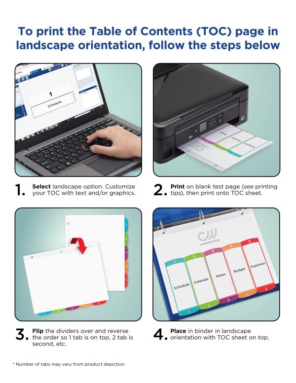 - Double-sided section titles page and tab dividers provide flexibility to use in portrait or landscape orientation