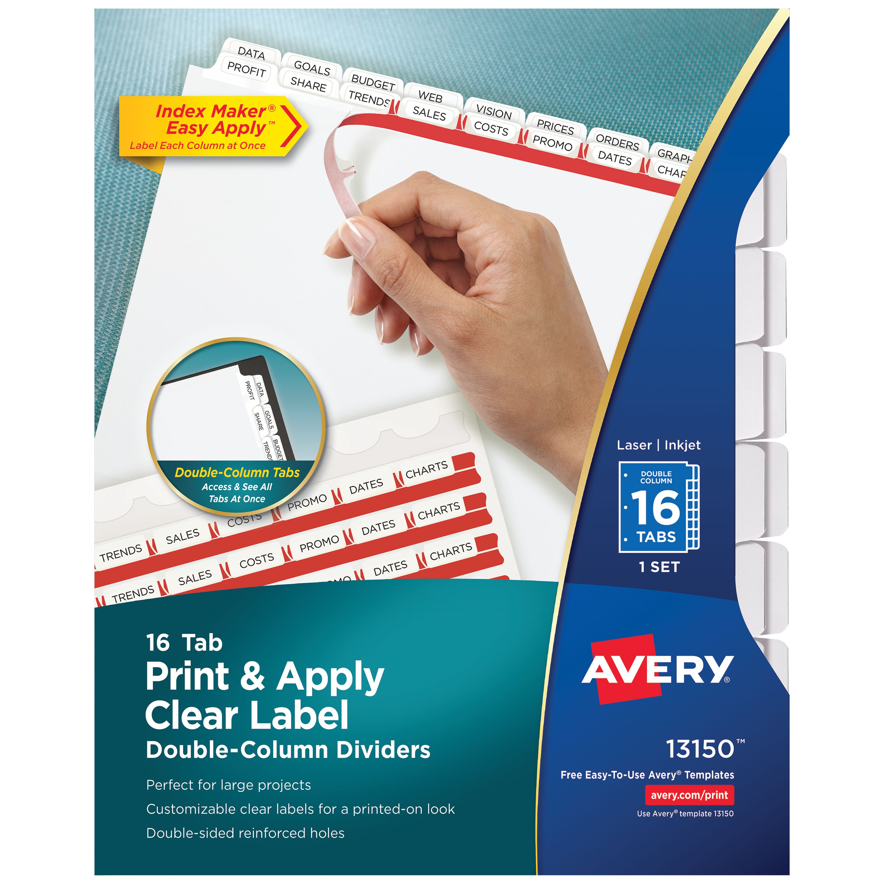 Avery® Print & Apply Clear Label Double-Column Dividers, Index Maker® Easy Apply™ Printable Label Strip, 16 White Tabs (13150)