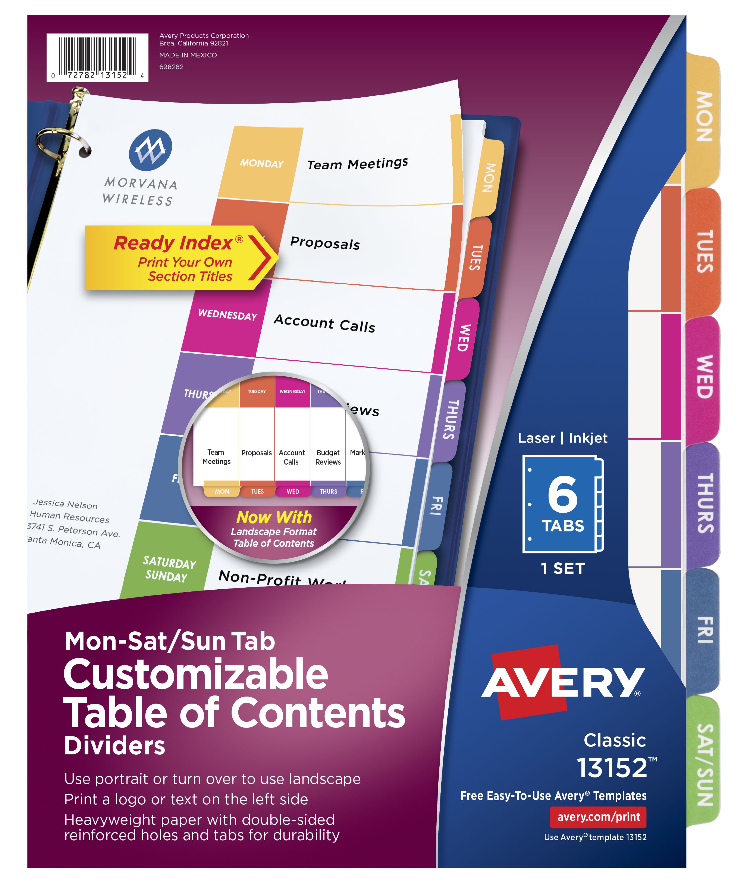 Avery® Customizable Table of Contents Dividers, Ready Index® Printable Section Titles, 6 Preprinted Mon-Sat/Sun Multicolor Tabs, 1 Set (13152)