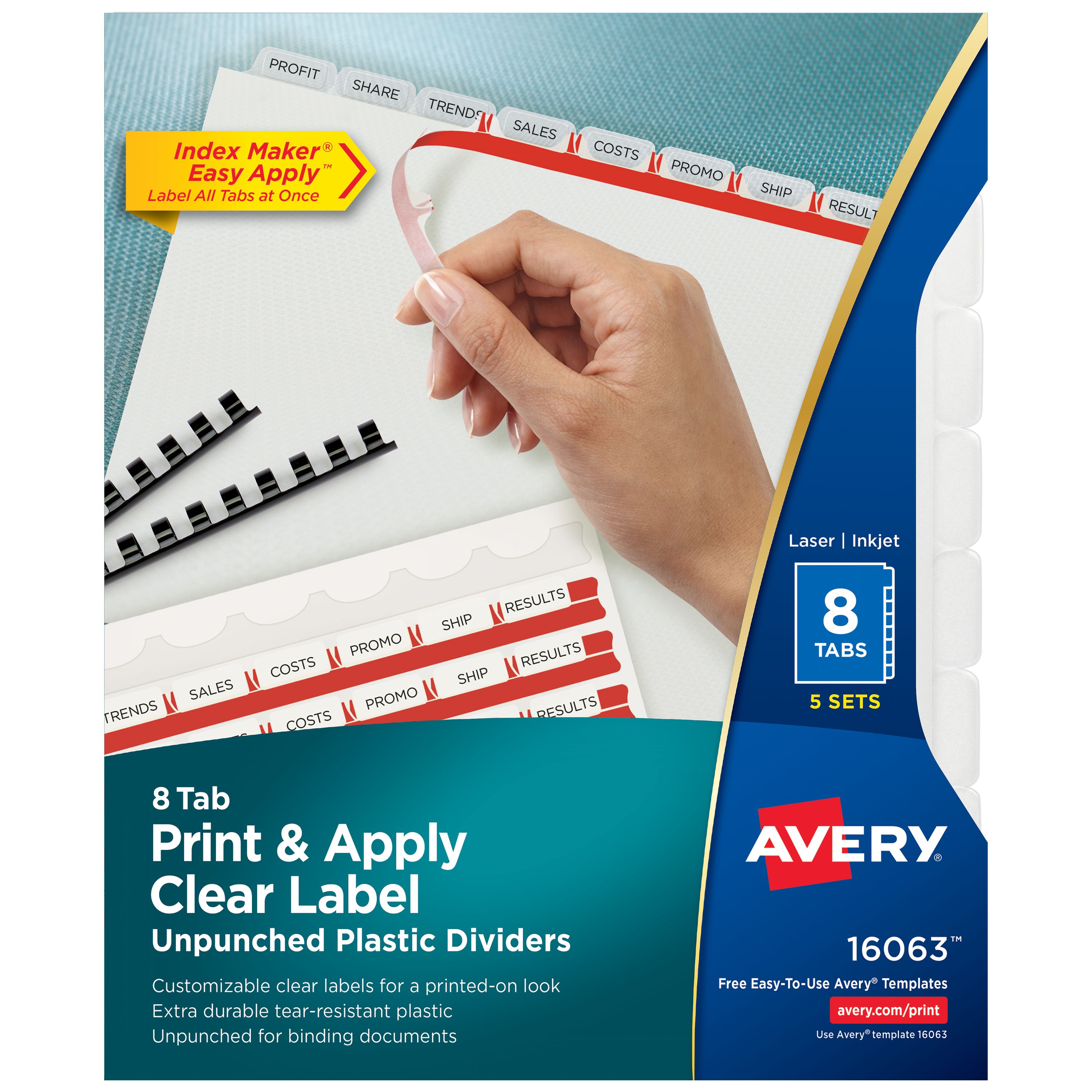 Avery® Print & Apply Clear Label Unpunched Translucent Plastic Dividers, Index Maker® Easy Applyâ„¢ Printable Label Strip, 8 Frosted Tabs, 5 Sets (16063)