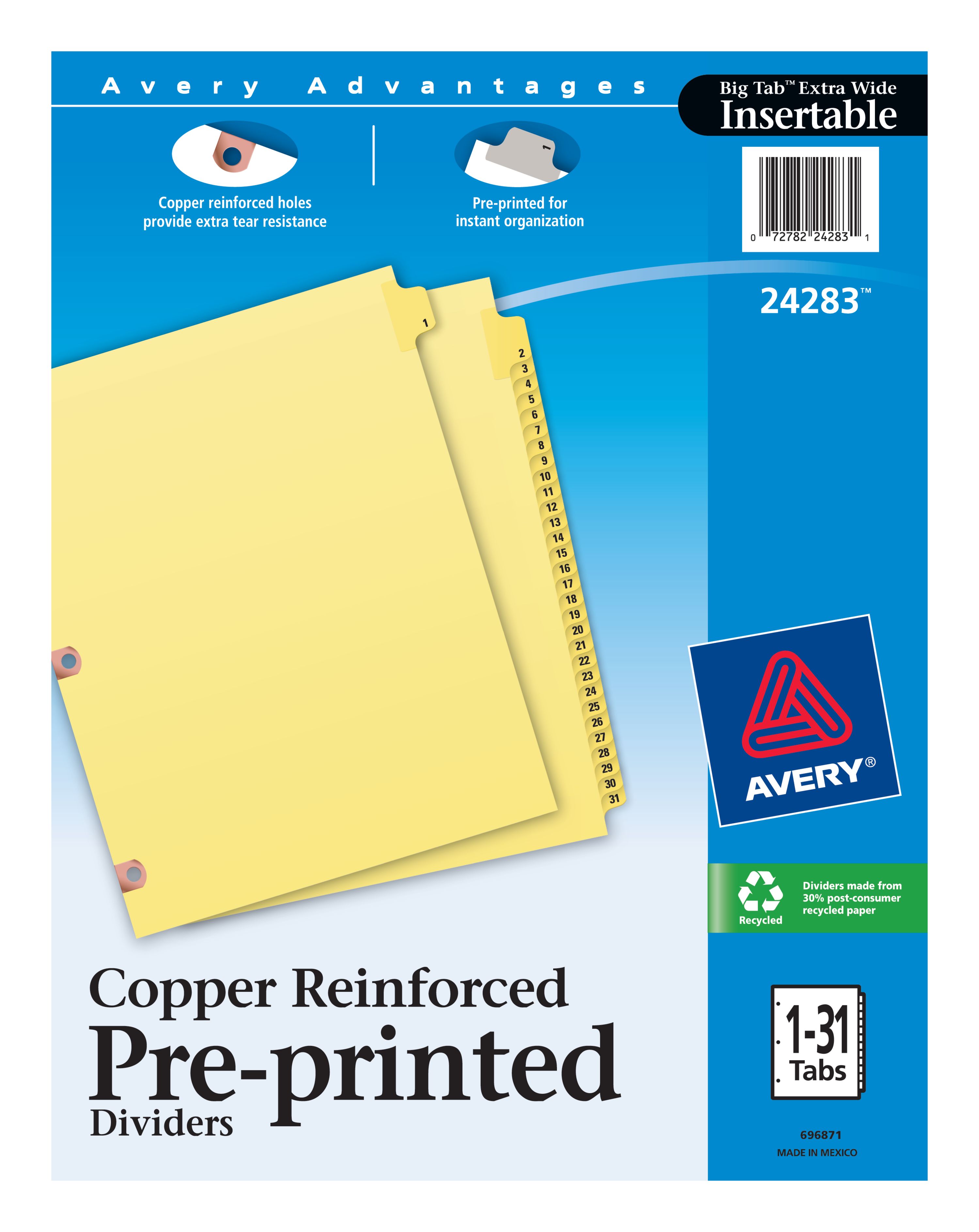 Avery® Preprinted Dividers, Copper Reinforced, 31-Tab Set, 1-31 (24283)