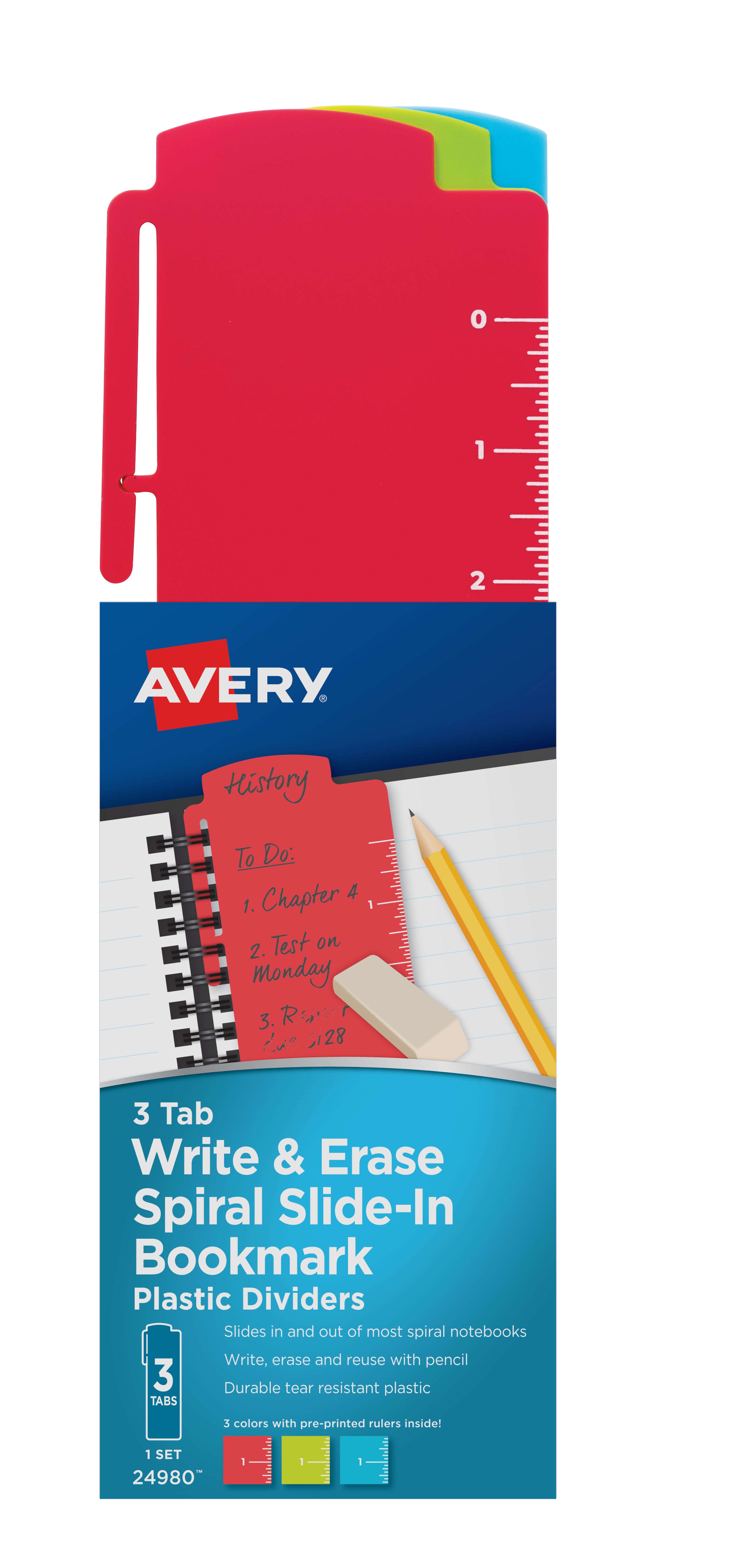 Avery® Spiral Slide-In Plastic Bookmark Dividers, Write & Erase, 3-Tab Set, Assorted Colors (24980)