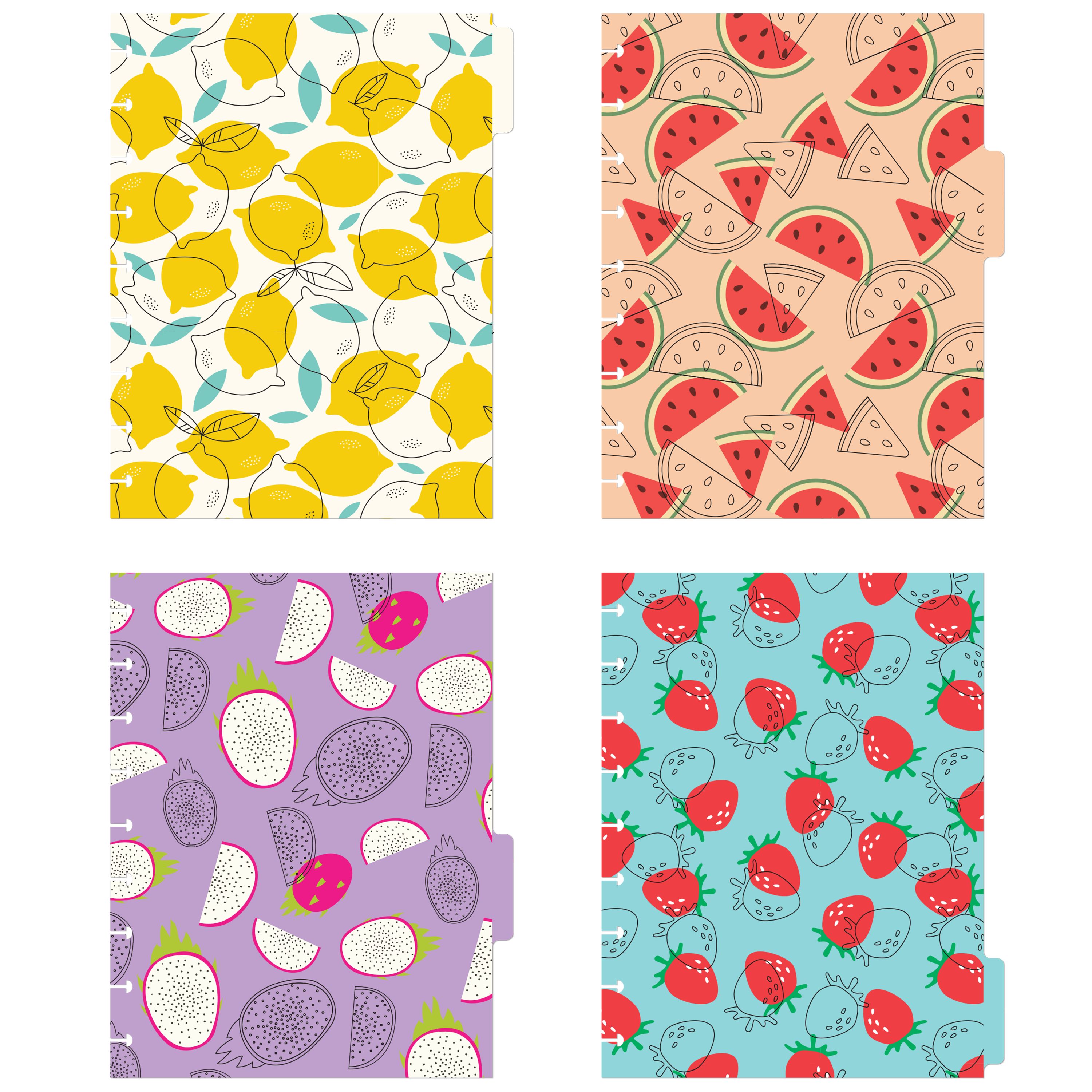 - Complement your planner with fashionable planner dividers with tabs featuring our Fruity Doodle Food Design