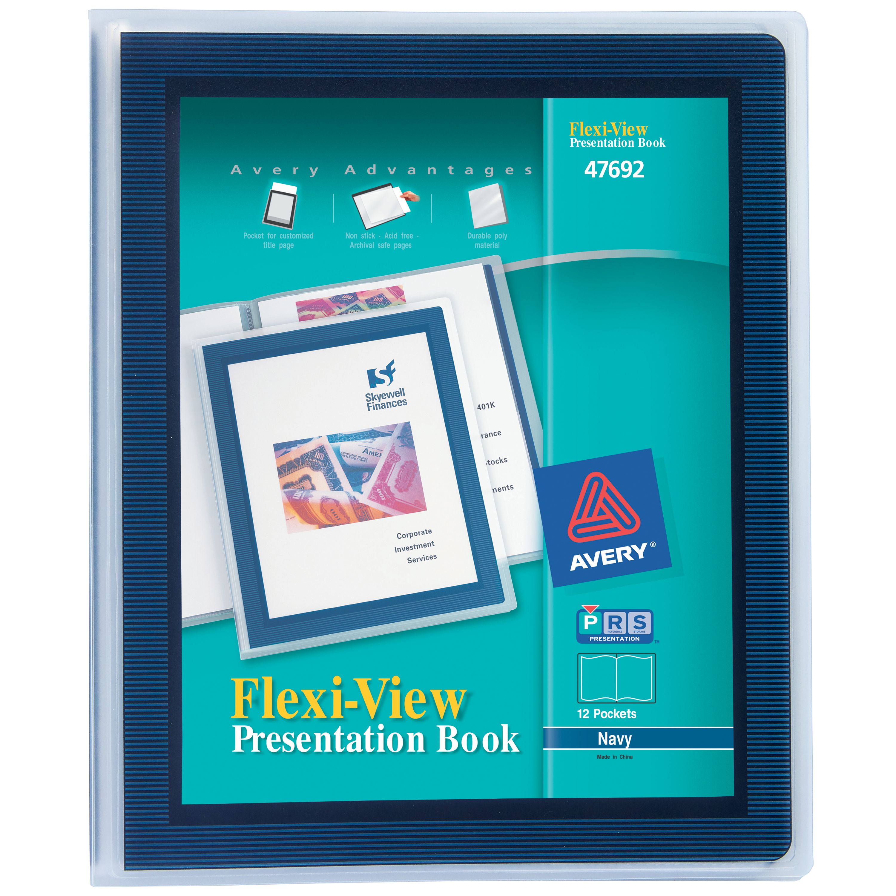 Present a report worth showing off with Avery 47692 Flexi-View Presentation Book. The plastic, clear front display book with a blue framed window features 12 bound clear sleeves designed to hold up to 24 documents or photos. Keep your presentation looking clean and presentable as these bound sleeves are also designed to protect your pages from dirty hands and other elements. To organize, simply slide the pages into each bound sheet protector. No hole-punching needed. Once inserted, the non-stick, acid free clear archival safe sleeves are also designed to not lift or transfer print. Easily view your report as the permanently bound sleeves will help you lay the presentation book flat. Since they are bound to the spine, there’s no need to worry about obnoxious page overlap typically caused by fasteners. Create a memorable first-impression as the portfolio cover features a flexi-view clear front, blue window frame designed to display your customizable title page. Whether your documents are for school, home, or work, use the predesigned binder templates and designs at avery.com/templates to create your own customized report cover page.