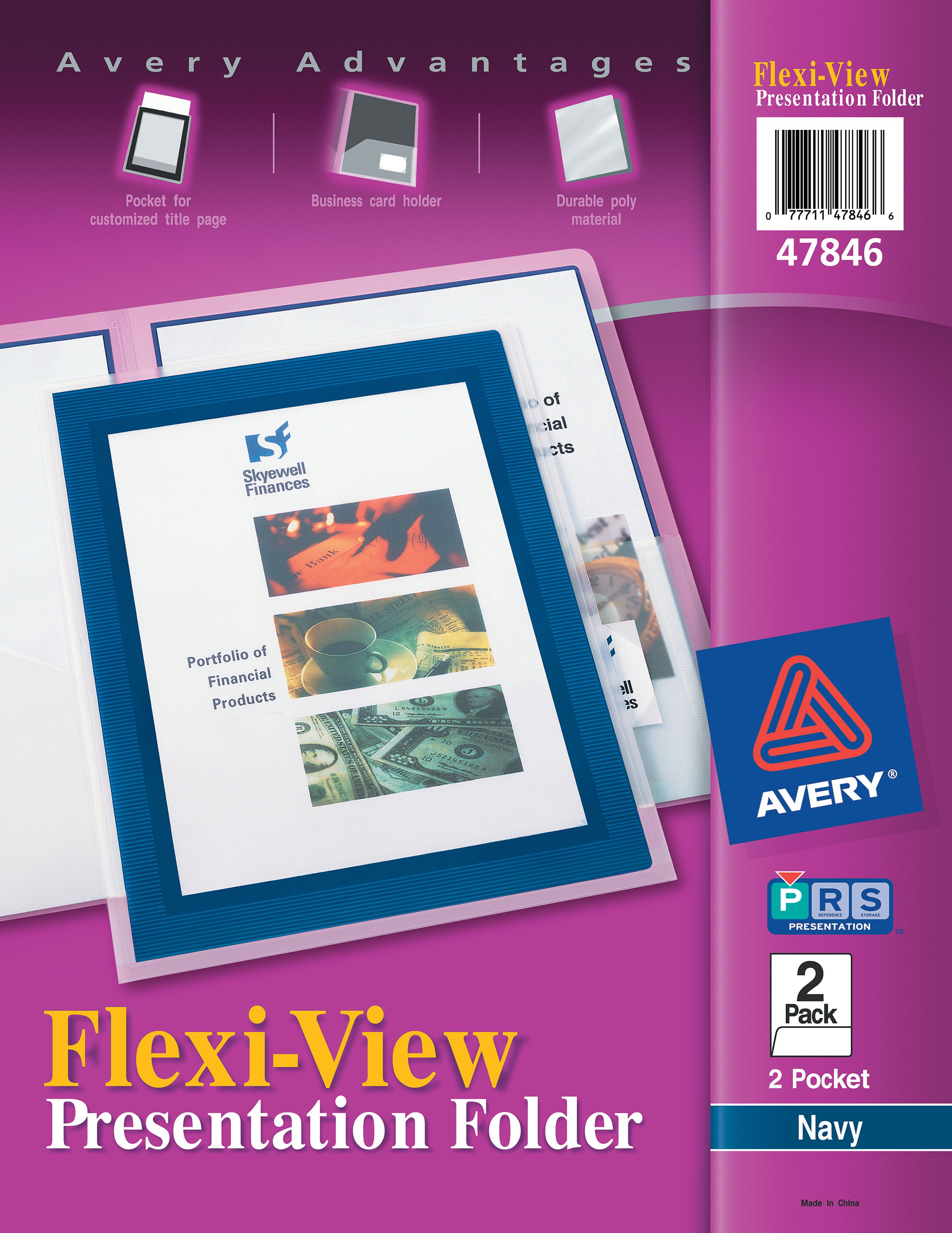 Organize and present your documents with Avery 47846 Flexi-View Two Pocket Folders. These navy blue, plastic folders with pockets feature a clear-frame front cover designed to hold a customized cover page. Whether your documents are for school, home, or work, use the predesigned binder templates and designs at avery.com/templates to create your own report cover page. Keep your documents in a clean presentable condition as the non-stick poly material is designed not to lift print. For frequent use, these premium 2 pocket folders are sturdy enough for much need durability. Yet, the pocket folders are lightweight enough for easy portability.