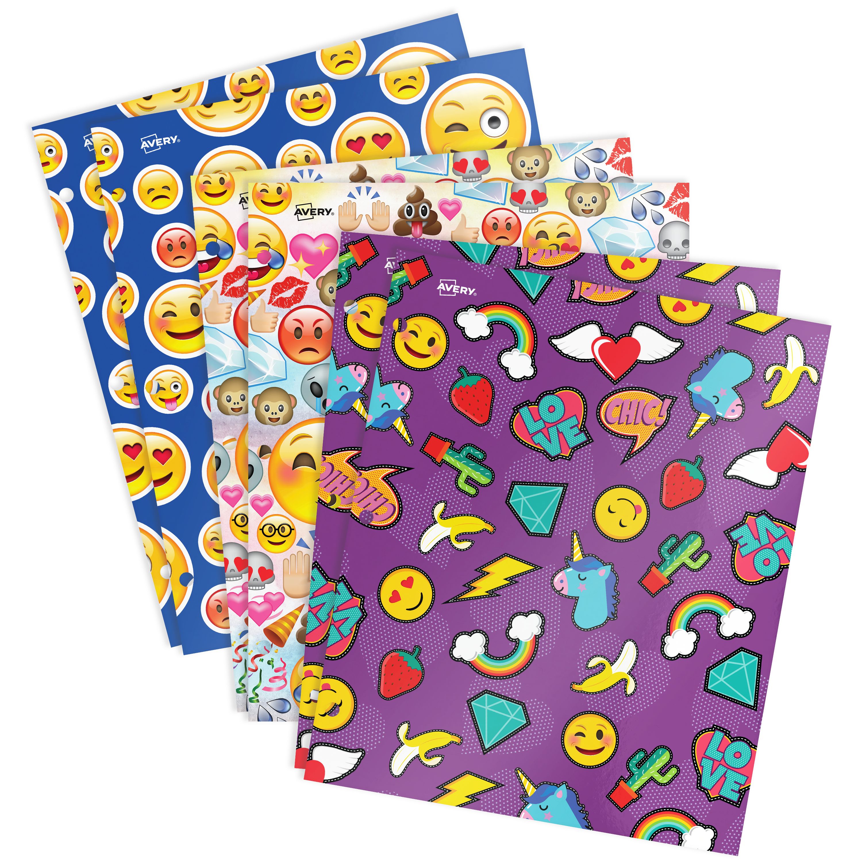 Avery® Two-Pocket Paper Folders 3-Hole Punched, 100-Sheet Capacity, 3 Emoji Designs (2 ea.), 6 Folders (47942)