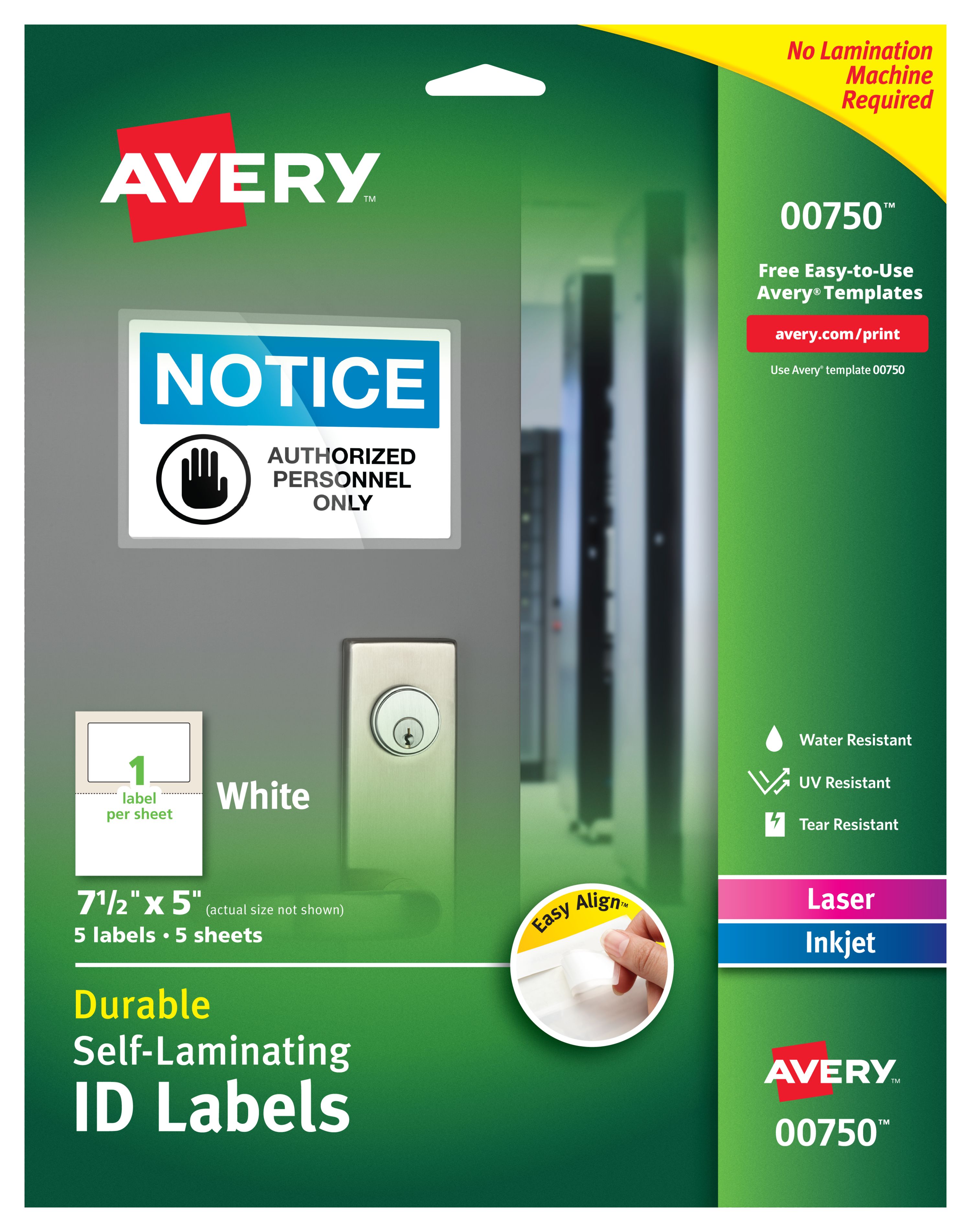 Avery® Easy Align® Self-Laminating ID Labels, Permanent Adhesive, 7-1/2" x 5", 5 Labels (00750)