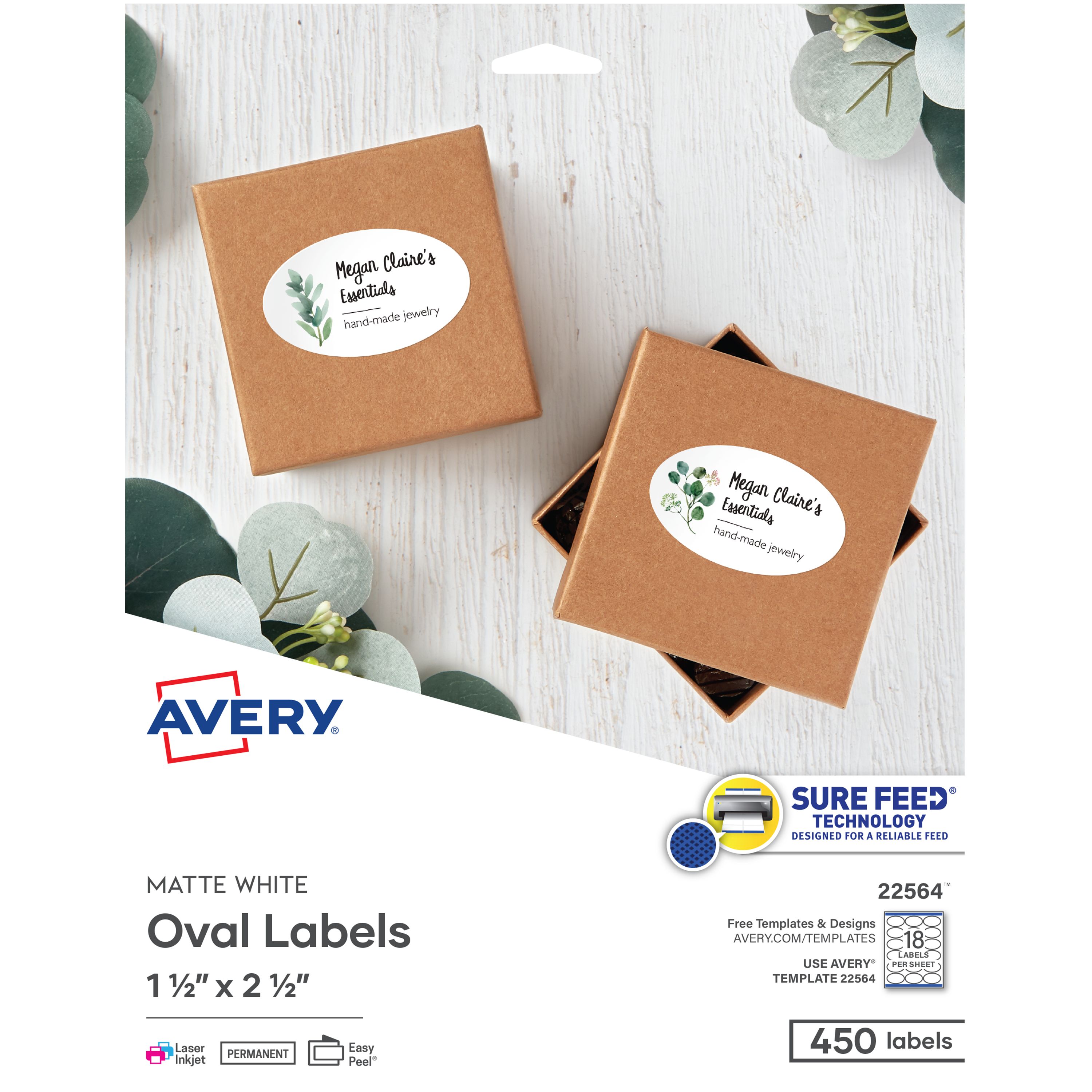 Put the perfect finishing touch to your product, gift, or personal creation with Avery 22564 Matte White Oval Labels. Use this pack of 450 1-1/2†x 1-1/2†printable labels to craft custom labels that allow your colors and text to really stand out. Save time with Easy Peel label sheets with Pop-up Edge that allow for fast and effortless peeling. Labels hold firm to most smooth surfaces like paper, cardboard, metal, glass with permanent adhesive that prevents lifting, curling or falling off. Create professional looking labels with our print-to-the-edge capability that results in full bleed designs with no margins. These printable labels are compatible with both inkjet and laser printers, while our proprietary Sure Feed technology delivers a more reliable feed through your printer avoid misalignment and paper jams. Write directly on labels or personalize them with your own graphics, photos, and text. You can also find free designs at