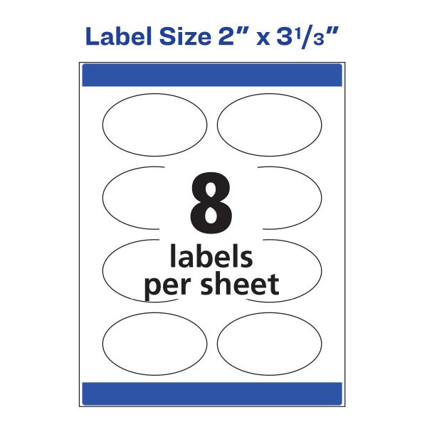 Add a premium look and feel to your products and projects with Avery Water-Resistant Oval Labels (22829). This pack of 80 textured white 2" x 3-1/3" printable labels is water resistant and holds up to moisture, scuffing and tearing, making them great for water bottles, jar labels, canning labels and more. Save time with Easy Peel label sheets with Pop-up Edge that allow for fast and effortless peeling. Labels hold firm to most smooth surfaces like paper, cardboard, metal, glass with permanent adhesive that prevents lifting, curling or falling off. Create stunning, professional looking labels with our print-to-the-edge capability that results in full bleed designs with no margins. These printable labels are compatible with both inkjet and laser printers, while our proprietary Sure Feed technology delivers a more reliable feed through your printer to help avoid misalignment and paper jams. Write on labels or use your own graphics, photos and text. You can also find free templates and fonts at