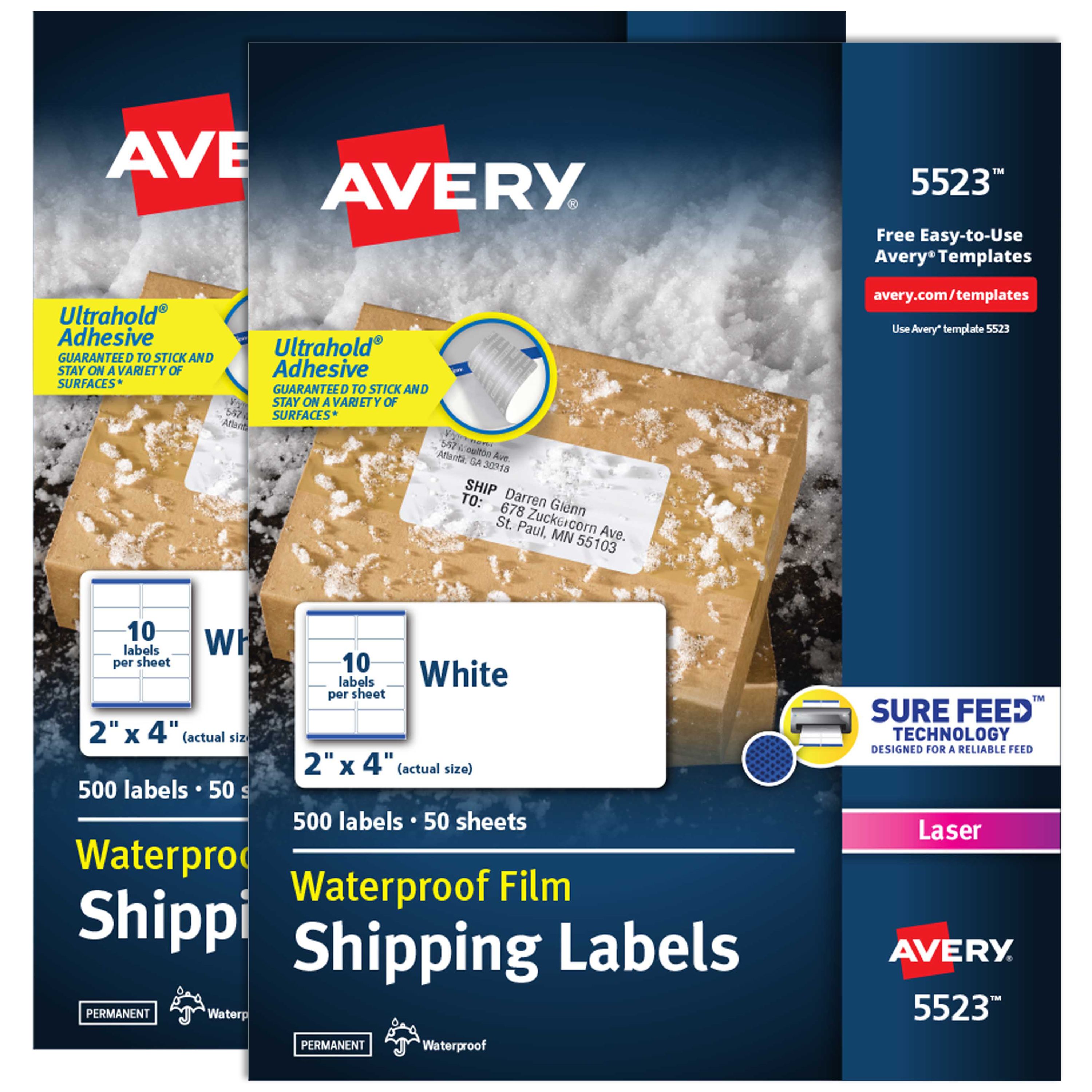 Make sure you're using the most secure labels with Avery 25523 mailing labels with Ultrahold permanent adhesive. Avery Ultrahold adhesive sticks and stays better than other basic labels on a variety of surfaces including envelopes, cardboard, paper, plastic, glass, tin and metal. Proprietary Avery Sure Feed label technology helps deliver a more reliable feed through your printer to prevent print misalignments and paper jams. Created with TrueBlock label material, these shipping labels will completely hide everything underneath so that you can cover older information and reuse old boxes and packaging. These 2" x 4" rectangle labels are also completely waterproof and will stay intact even when submerged in water. Great for product labels as they can reach grade A barcode readability and can withstand damage from scuffing, tearing, smudging and up to a year of UV light outdoors. They are also chemical resistant, making it easy to wipe away viruses and germs with multipurpose cleaners and disinfecting wipes.
