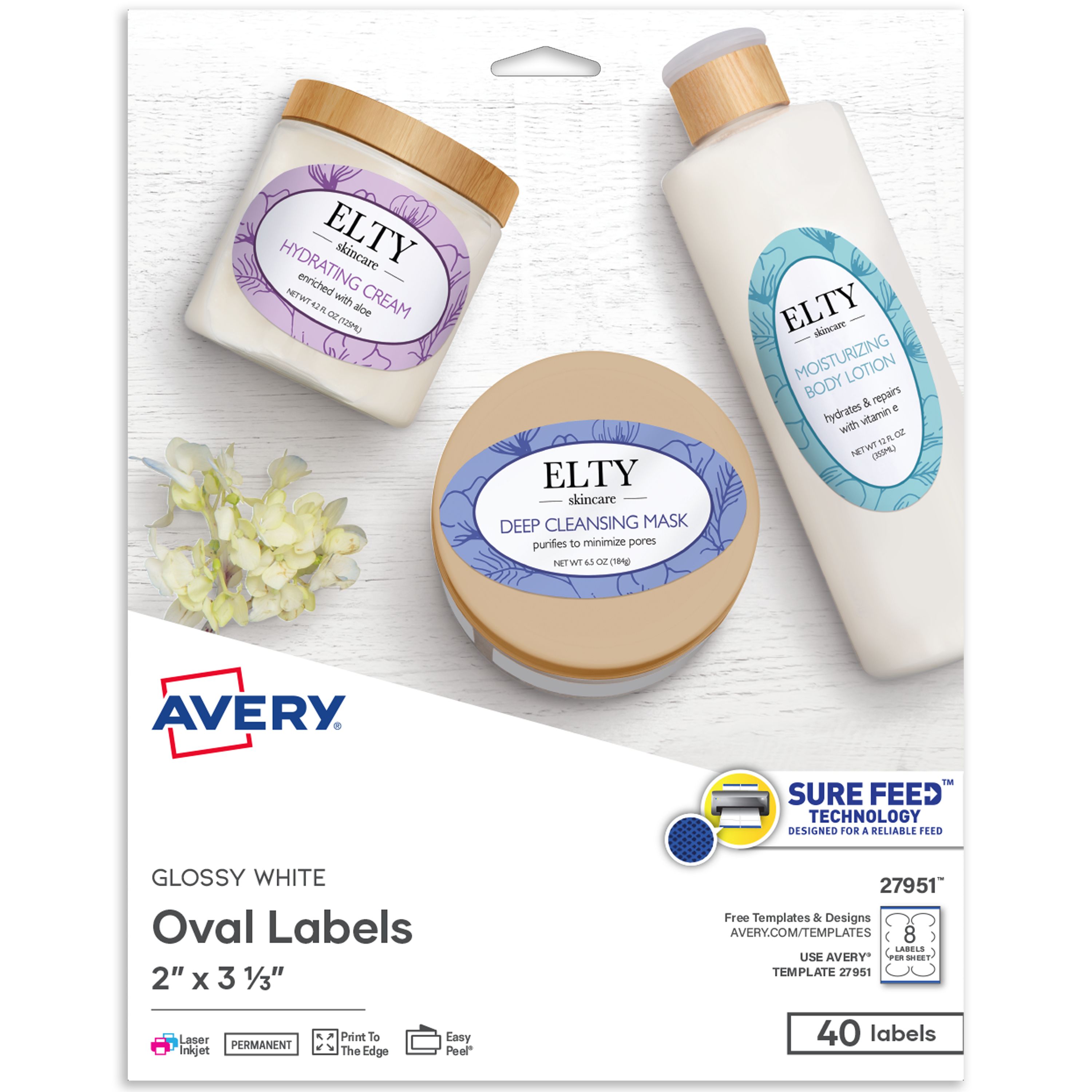 Avery® Oval Labels, 2" x 3-1/3", Glossy White, Sure Feed™ Technology, Print-to-the-Edge, Easy Peel®, Laser/Inkjet, Permanent, 40 Blank Oval Labels Total (27951)