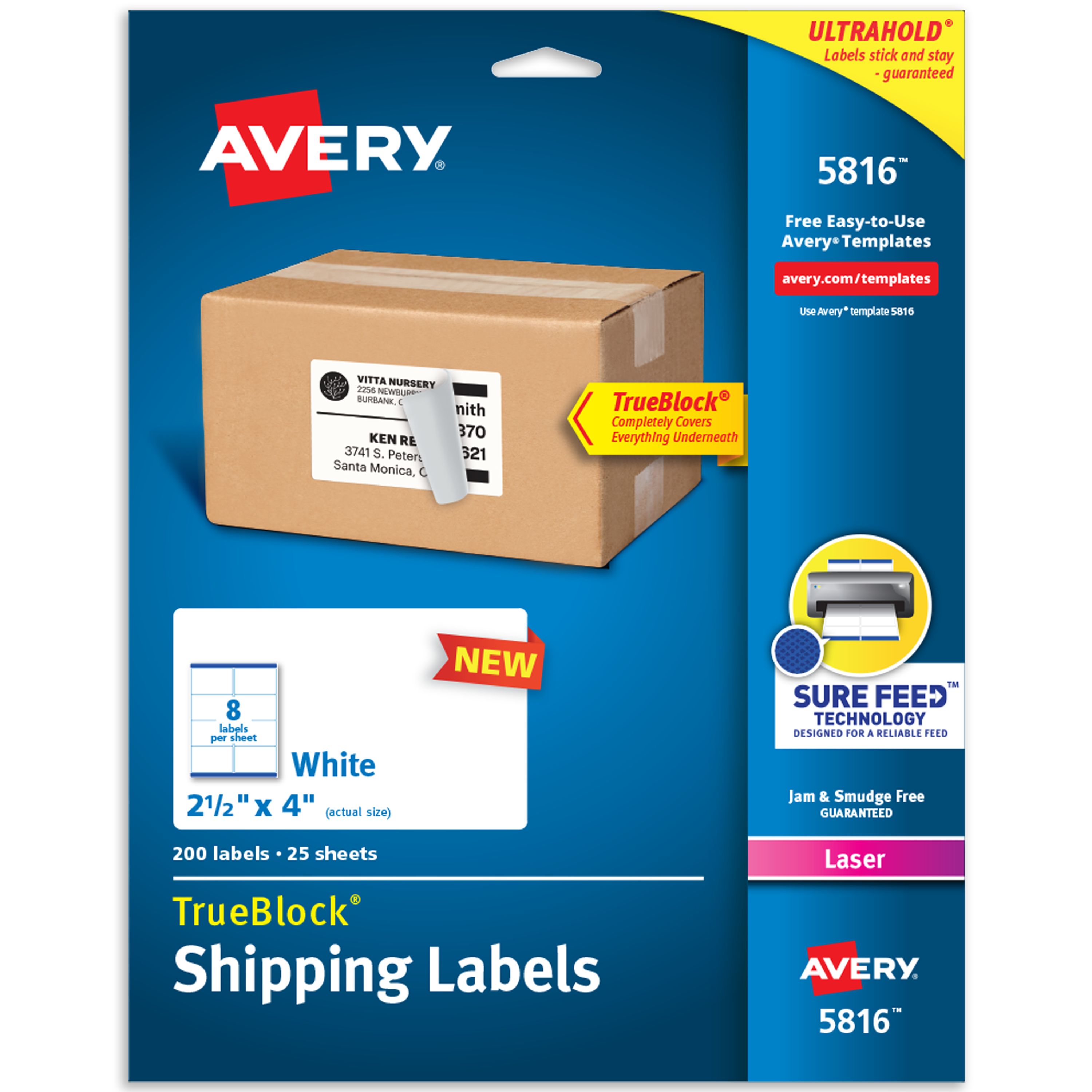 Create customized shipping address labels quickly and easily with Avery 5815 TrueBlock Shipping Labels. This pack of 200 2-1/2†x 4†white printable shipping labels is backed by Ultrahold permanent adhesive guaranteed to stick to most smooth surfaces, including cardboard, envelopes, paper, glass and metal without curling or falling off. Our True Block technology allows you to reuse boxes or other shipping materials by fully blocking out old labels and markings underneath the bright white labels. These 8-1/2" x 11" label sheets feature Sure Feed technology to prevent printer jams and misalignment, and are optimized for inkjet printers, resulting in crisp text and bold bright colors. Use your own logos or images to create personalized labels for gift tags, crafting, organizing projects and more, or create custom shipping labels using the free templates and designs at