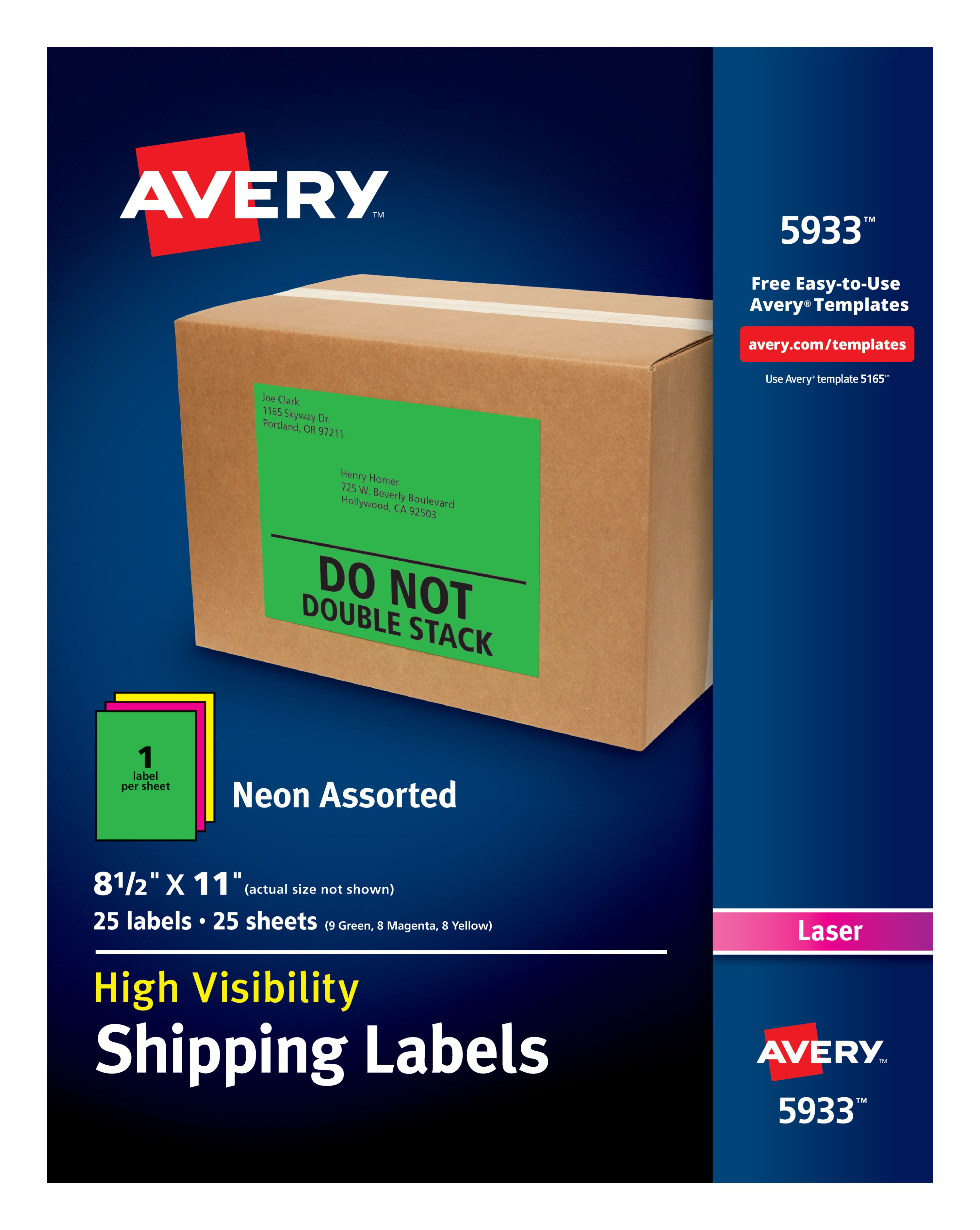 Avery® High-Visibility Shipping Labels, Permanent Adhesive, Assorted Neon Colors, 8-1/2" x 11", 25 Labels (5933)