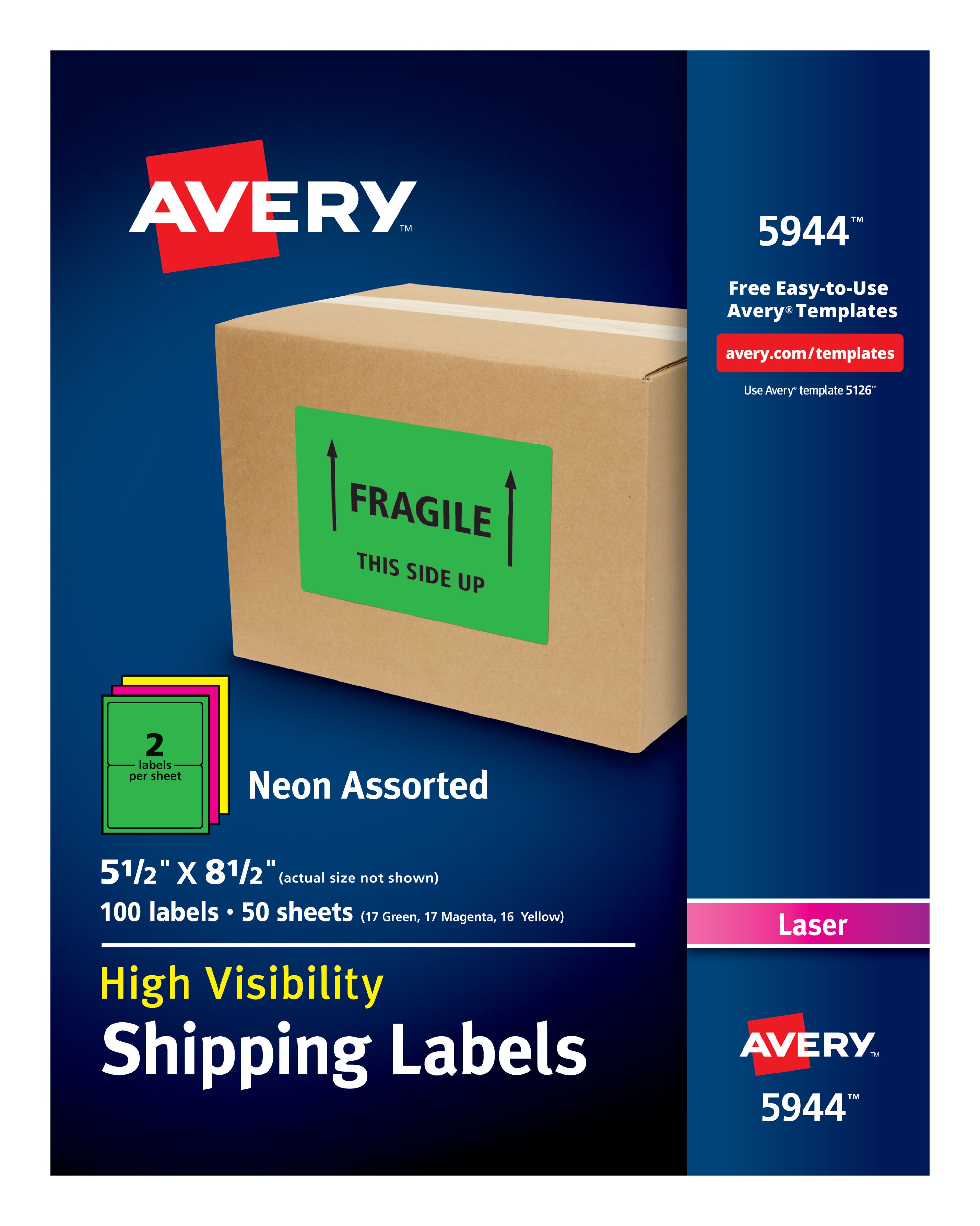 Avery® Neon Shipping Labels for Laser Printers, Assorted Colors, 5-1/2" x 8-1/2", 100 Neon Labels (5944)
