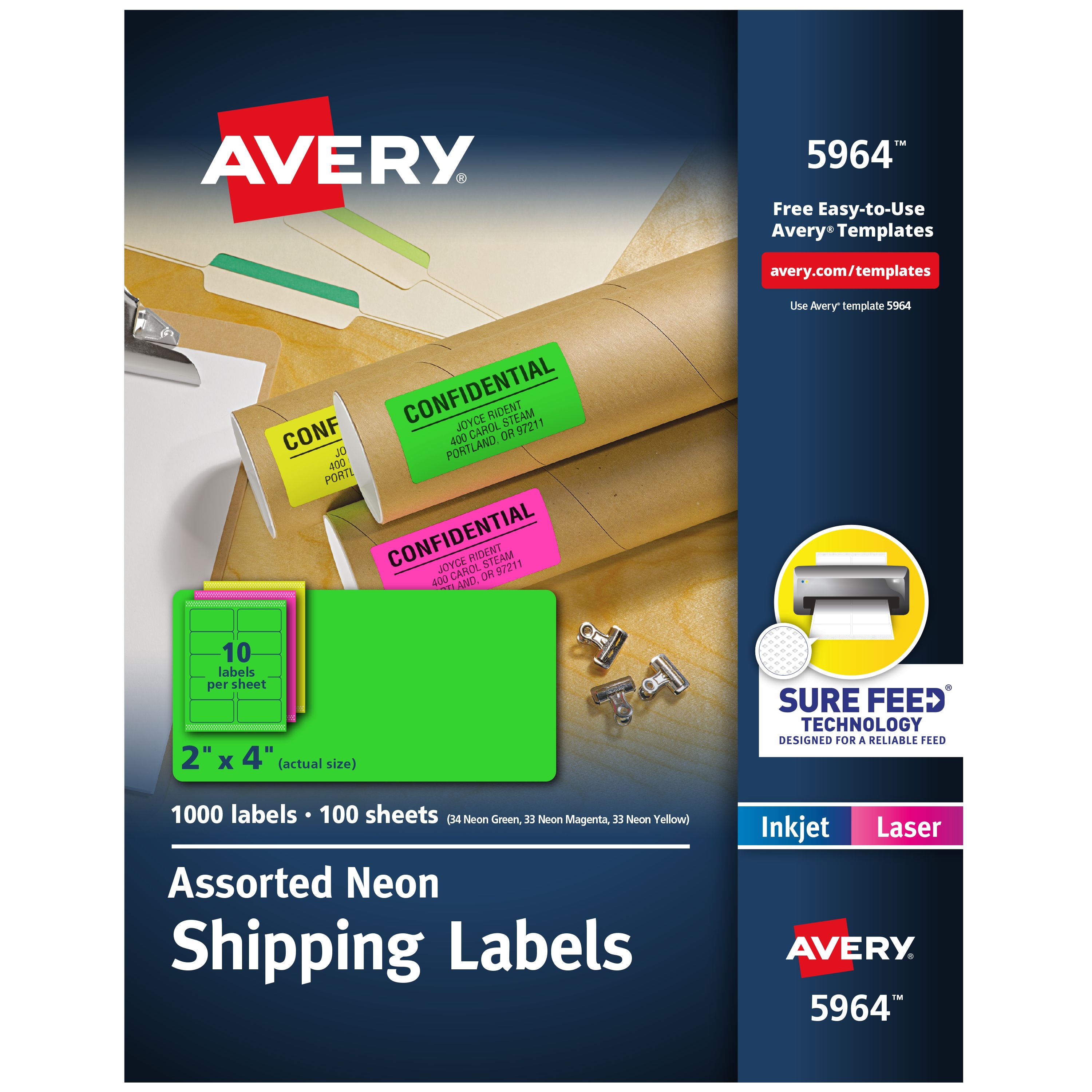 Avery Shipping Labels with Sure Feed, 2"x 4", Assorted Neon Colors, Laser & Inkjet Compatible, 1,000 Labels Total (5964)