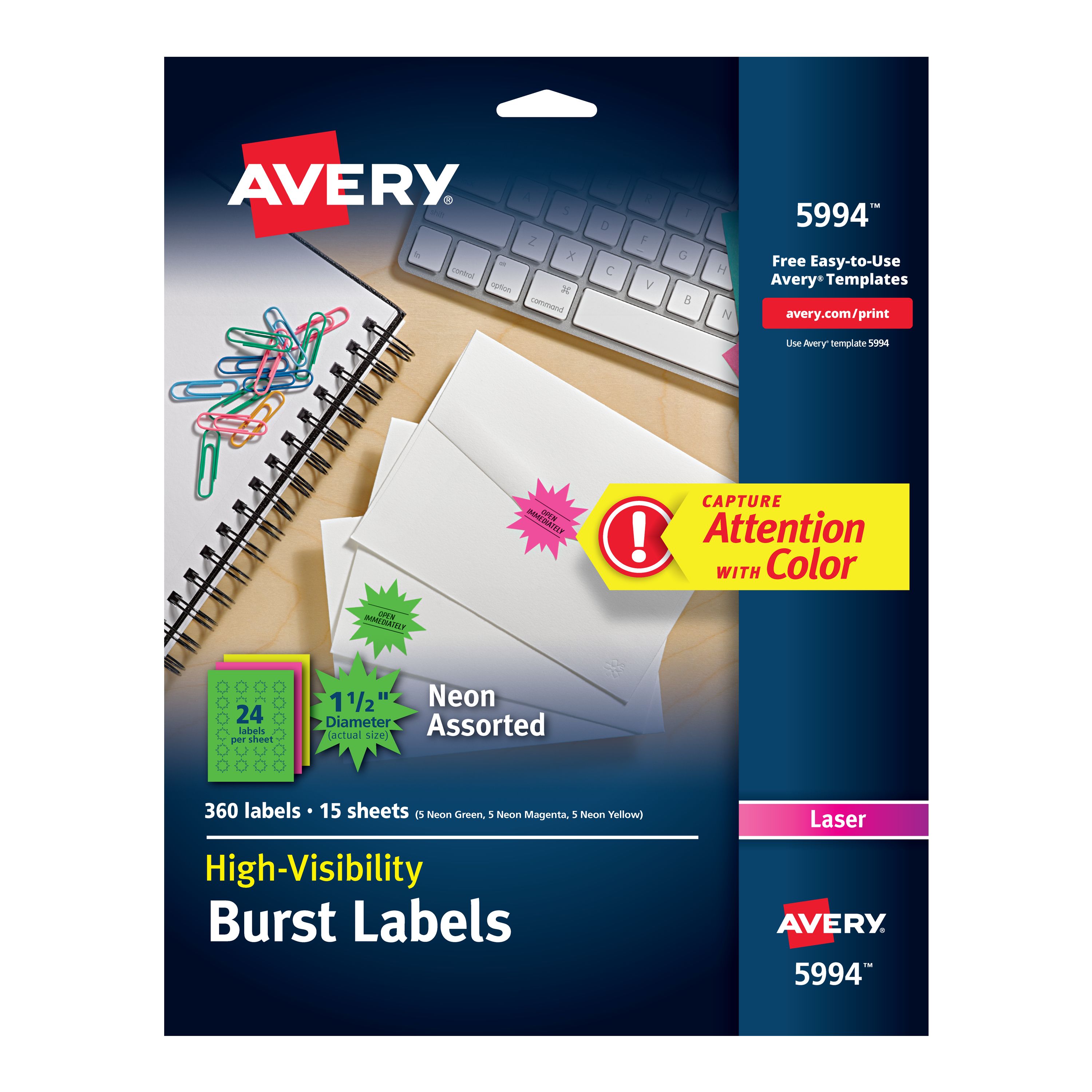 Avery® Neon Address Labels with Sure Feed™ for Laser Printers, 1-1/2", Assorted Colors, 360 Burst Labels (5994)