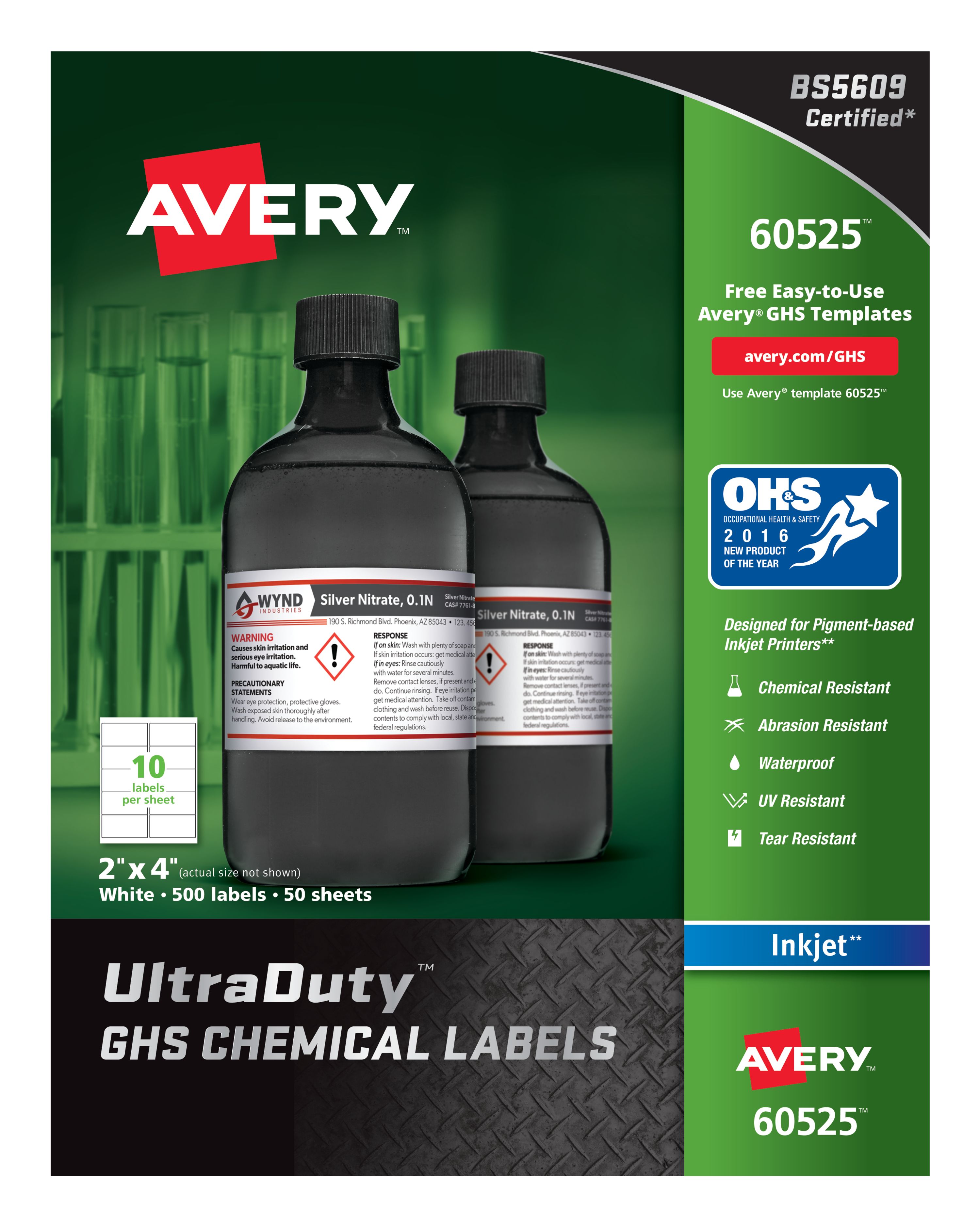 Avery® UltraDuty® GHS Chemical Labels for Pigment Inkjet Printers, Waterproof, UV Resistant, 2” x 4”, 500 Labels (60525)