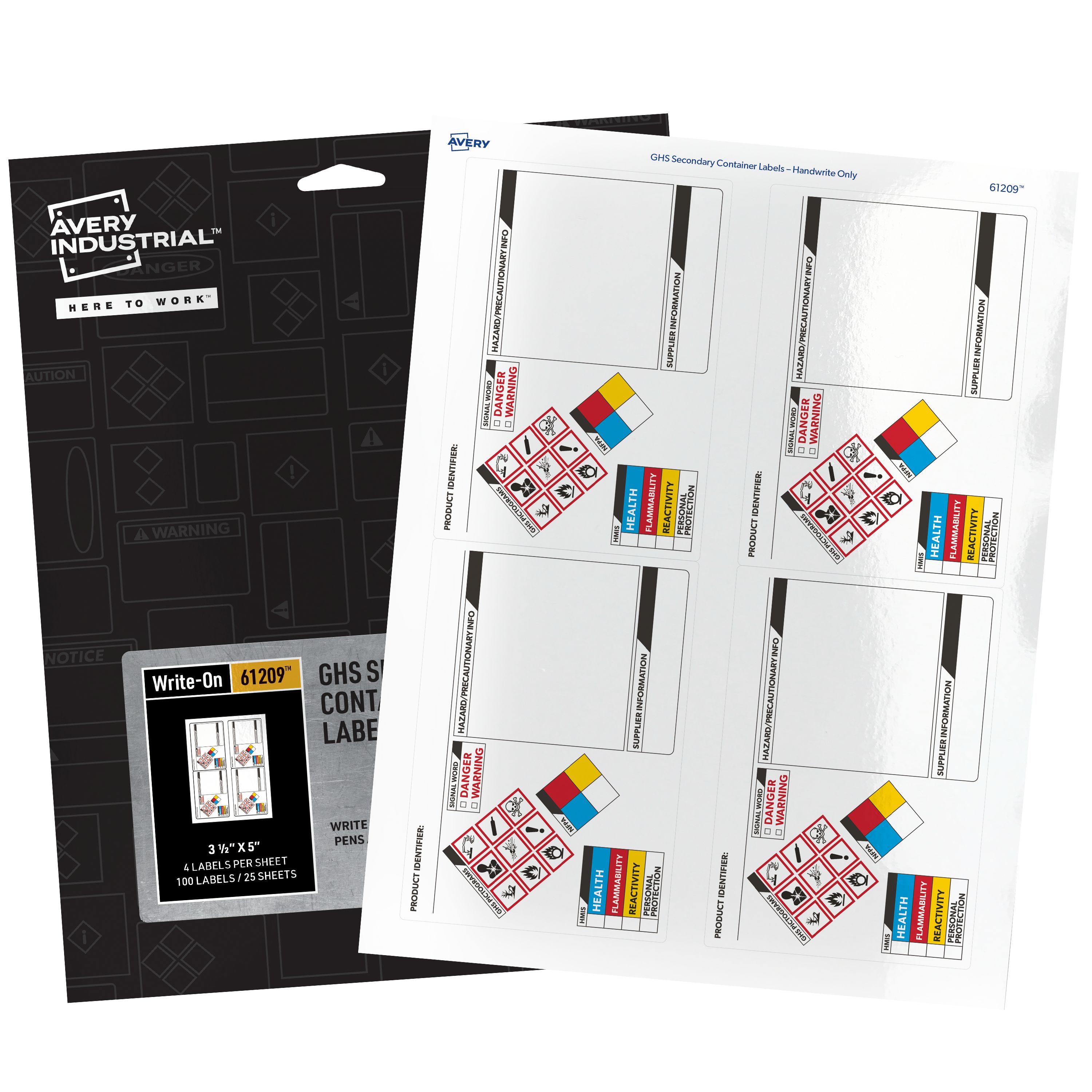 Avery® GHS Secondary Container Labels, Preprinted, Handwrite Only, 3.5" x 5", 100 Labels (61209)