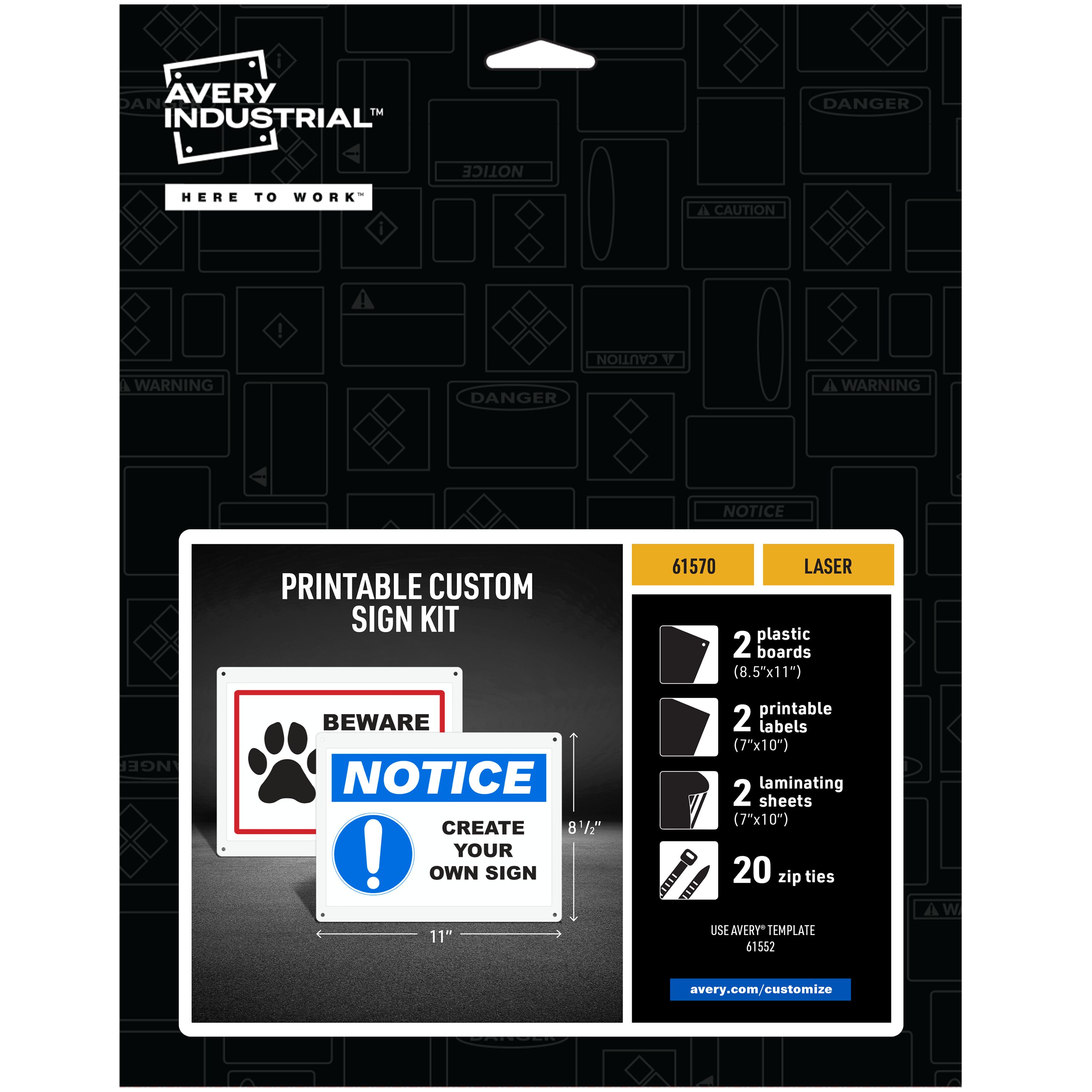 - Kit includes 2 plastic sign boards, 2 printable vinyl labels, 2 protective laminate sheets, 20 cable ties (4 cable ties per sign and 12 extra backup ties)