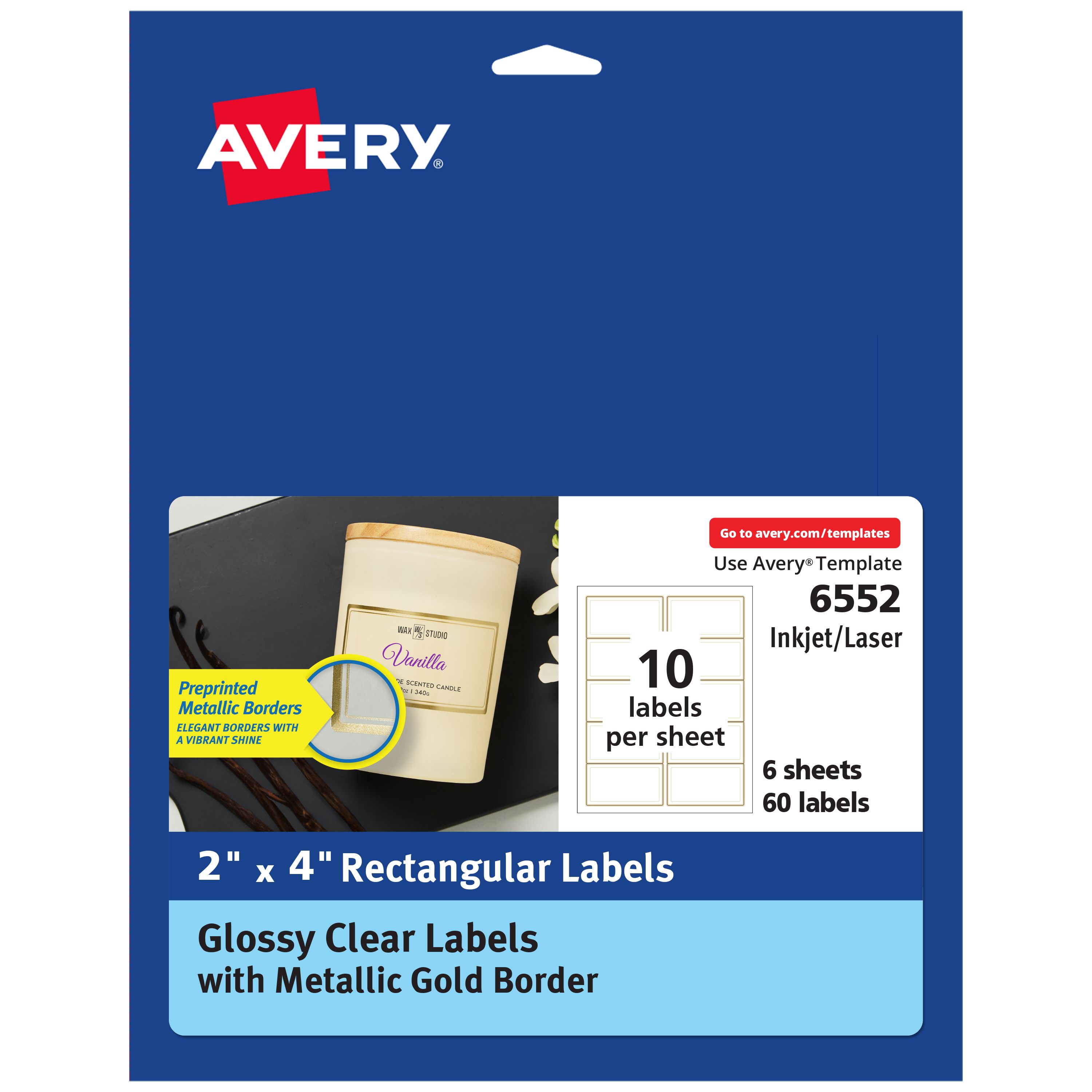 Add an elegant touch to products and events with this 60-pack of Avery 6552 Glossy Clear 2" x 4" Labels with Metallic Gold Borders. Featuring a stunningly reflective pre-printed gold border, the gilded edges add a brilliant glow to shipping labels, product labels, food labels, party favor labels, candle labels, and more. The permanent adhesive makes sure that each label sticks and stays on most smooth surfaces. Firmly adhere these labels to cardboard, paper, plastic, glass, tin, and metal. Whether you're starting with your own design or looking for something to start with, Avery Design & Print Online offers free label templates and tools for creating your own professional-looking custom labels. These labels are dual-compatible with both laser printers and inkjet printers, resulting in crisp, smudge-free printing. For best results, feed one sheet at a time and allow at least 60 seconds of drying time. Plus, these labels pair beautifully with other Avery labels, cards, tags, and tent cards featuring metallic gold borders for a complete and cohesive look.