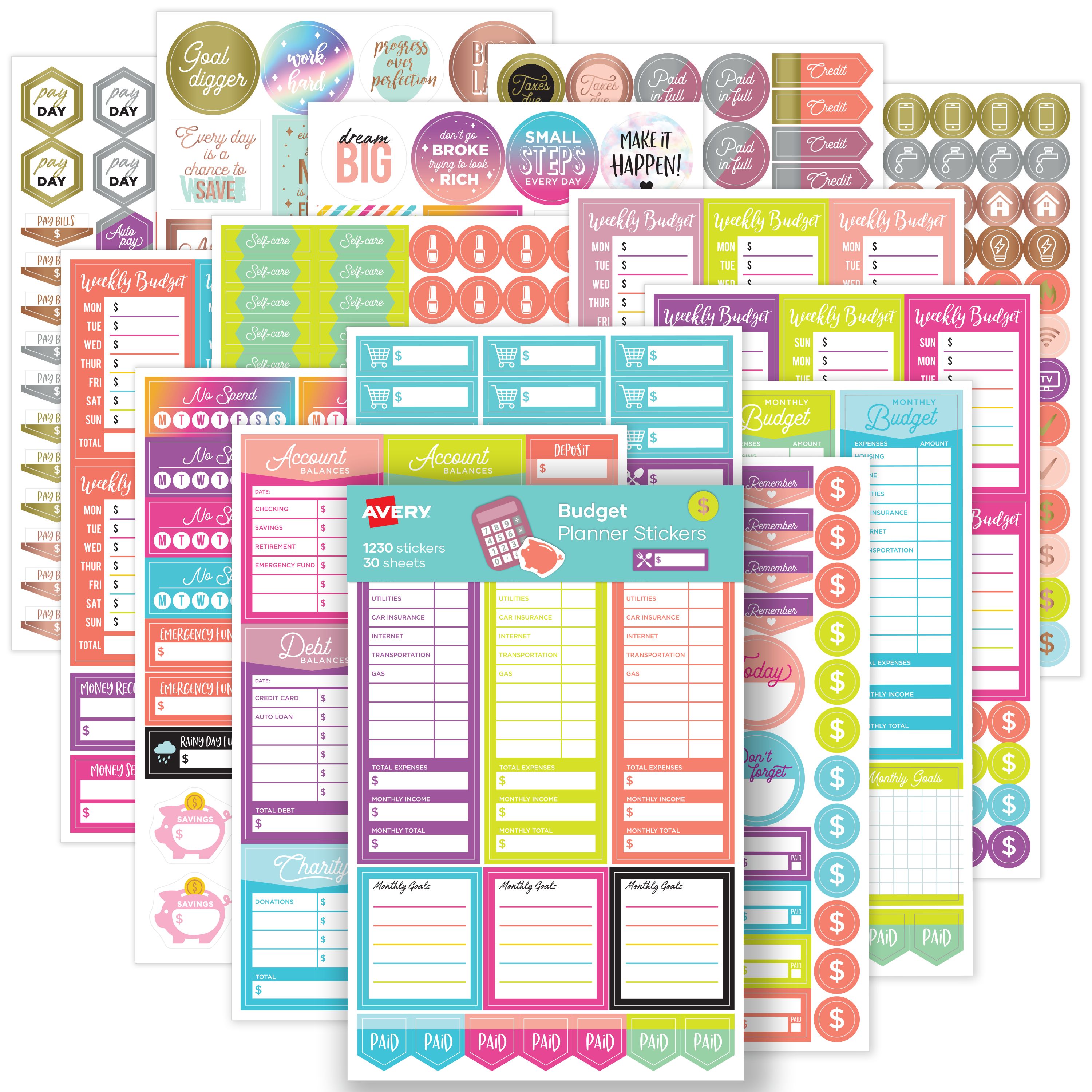 Avery® Budgeting Planner Stickers Variety Pack, 30 Sticker Sheets, 1,230 Stickers Total (6788)