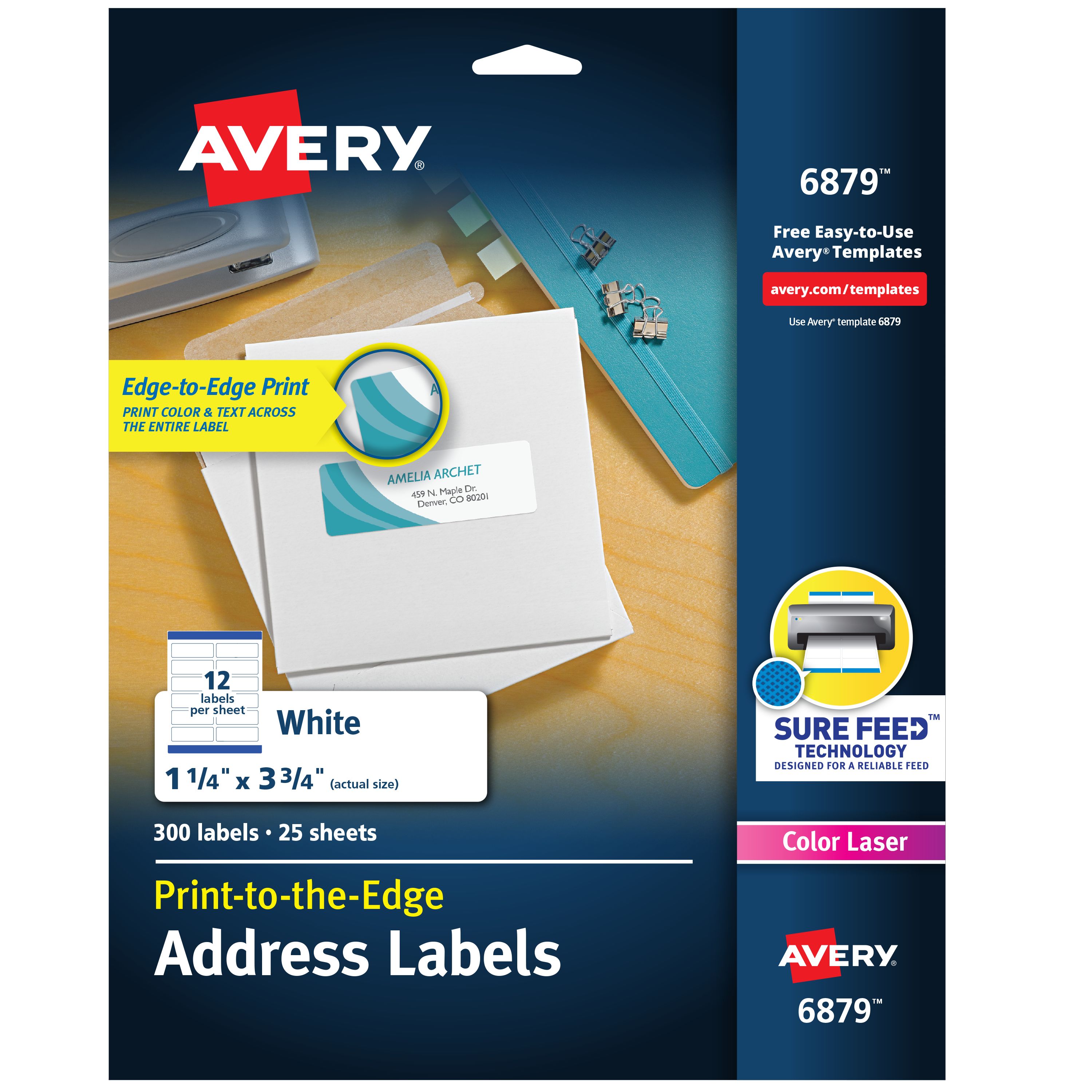 • Avery 6879 Labels feature proprietary Sure Feed™ technology to deliver a more reliable feed through your printer, preventing misalignments and jams